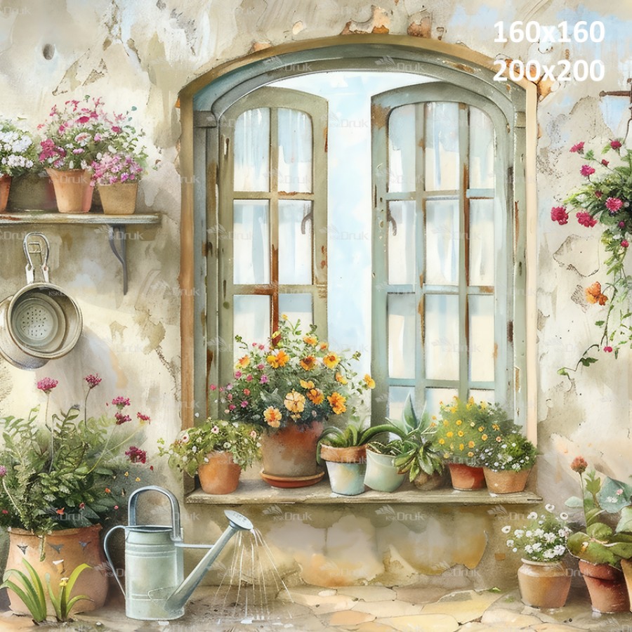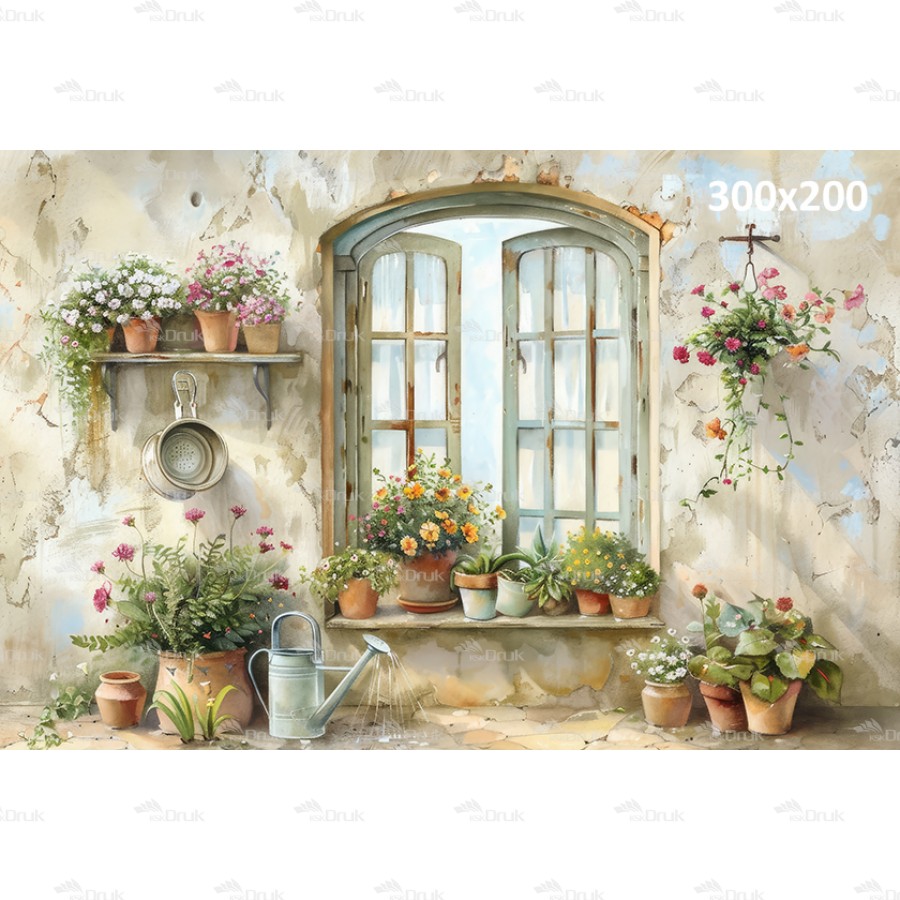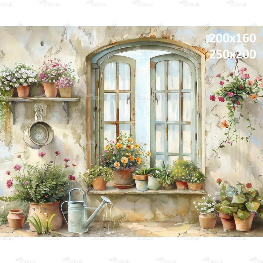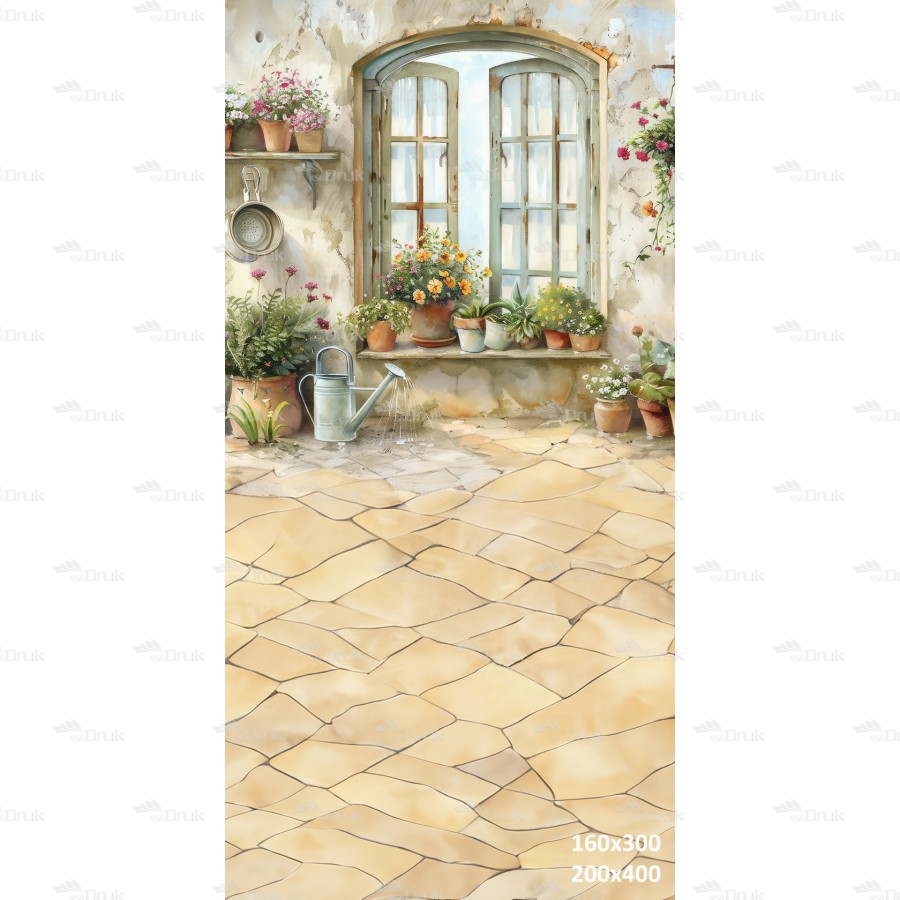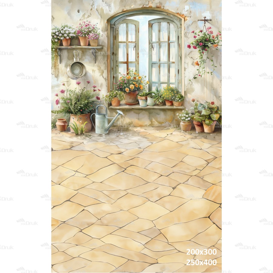 Tagi: Tło fotograficzne 2960, tło malowane, rysowane, wiosna, okno, drzwi, kwiaty, konewka, beżowy kolor, bruk