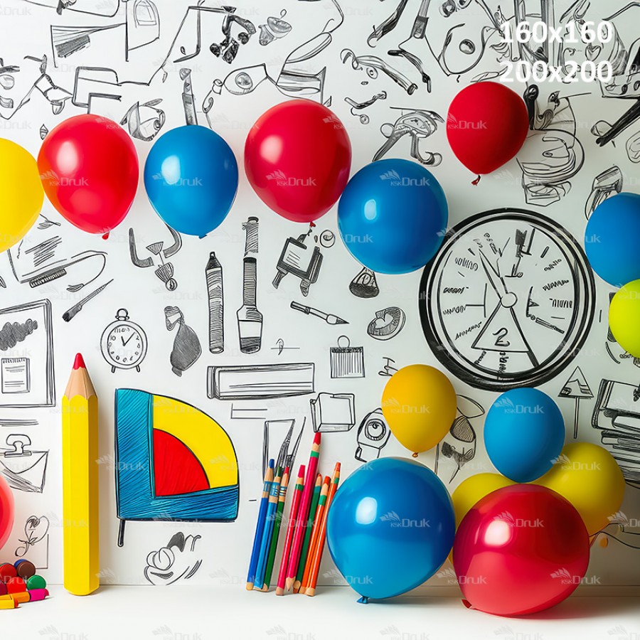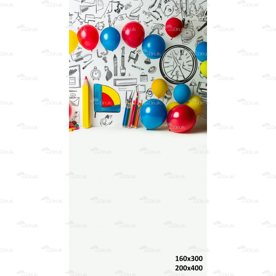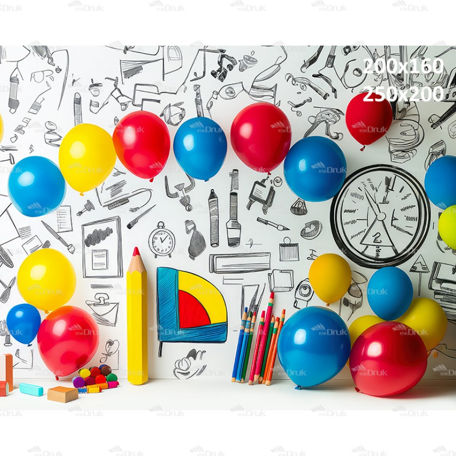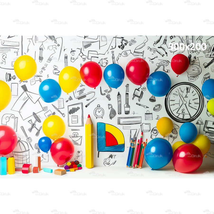 Tagi: Tło fotograficzne 3445, tło szkolne, tło przedszkolne, kredki, pędzle, rysunki na ścianie, balony