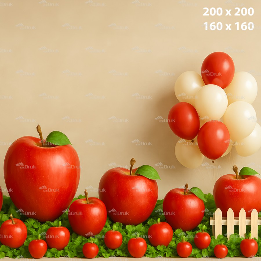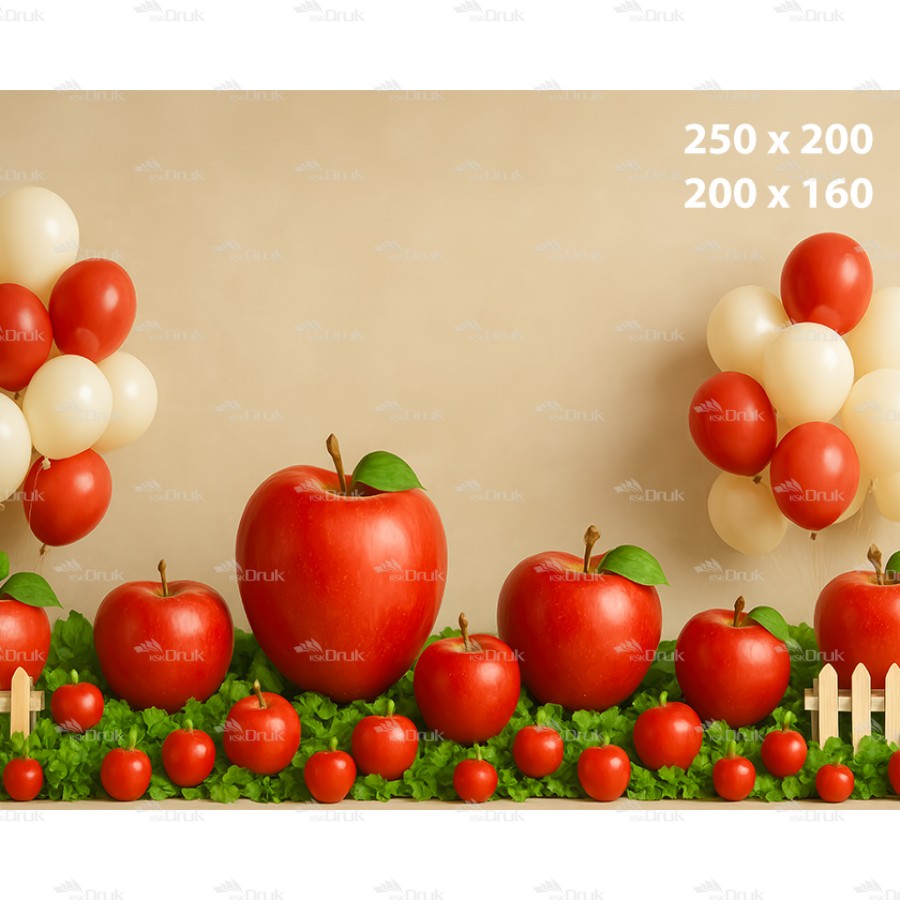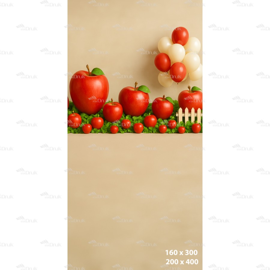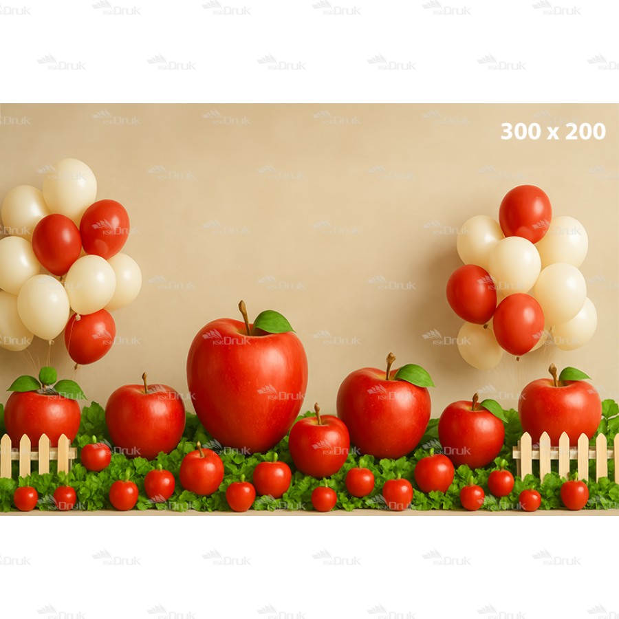 Tagi: Tło fotograficzne 3559, tło dziecięce, do przedszkola, owocowe, owoce, jabłka, balony, kremowy, beżowy, czerwony, zielony