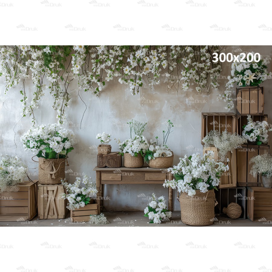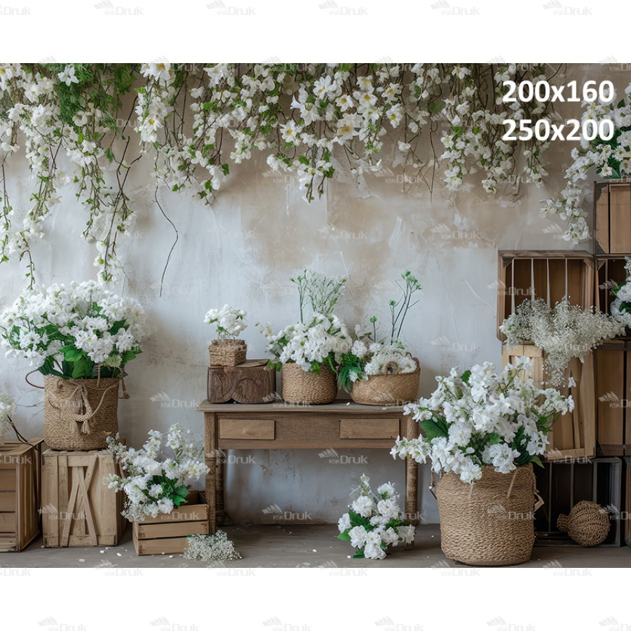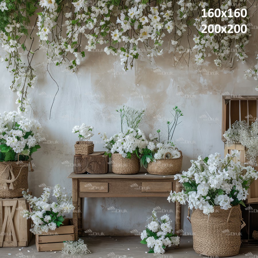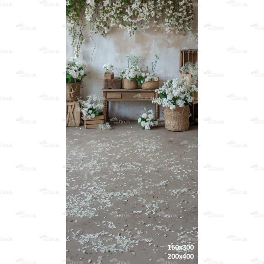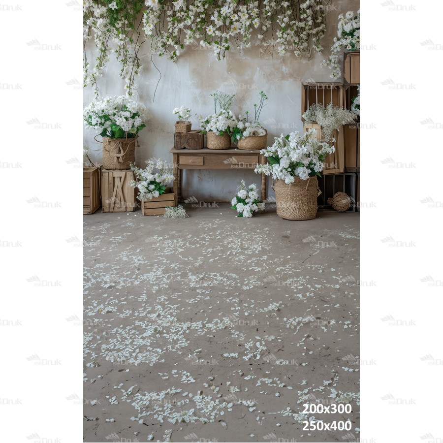 Tagi: Tło fotograficzne E237, tło wiosenne, drewniane skrzynki, stół, konsola, białe kwiaty, girlanda, bukiety, wiadra, kosze plecione, beżowa podłoga z płatkami kwiatów, beton