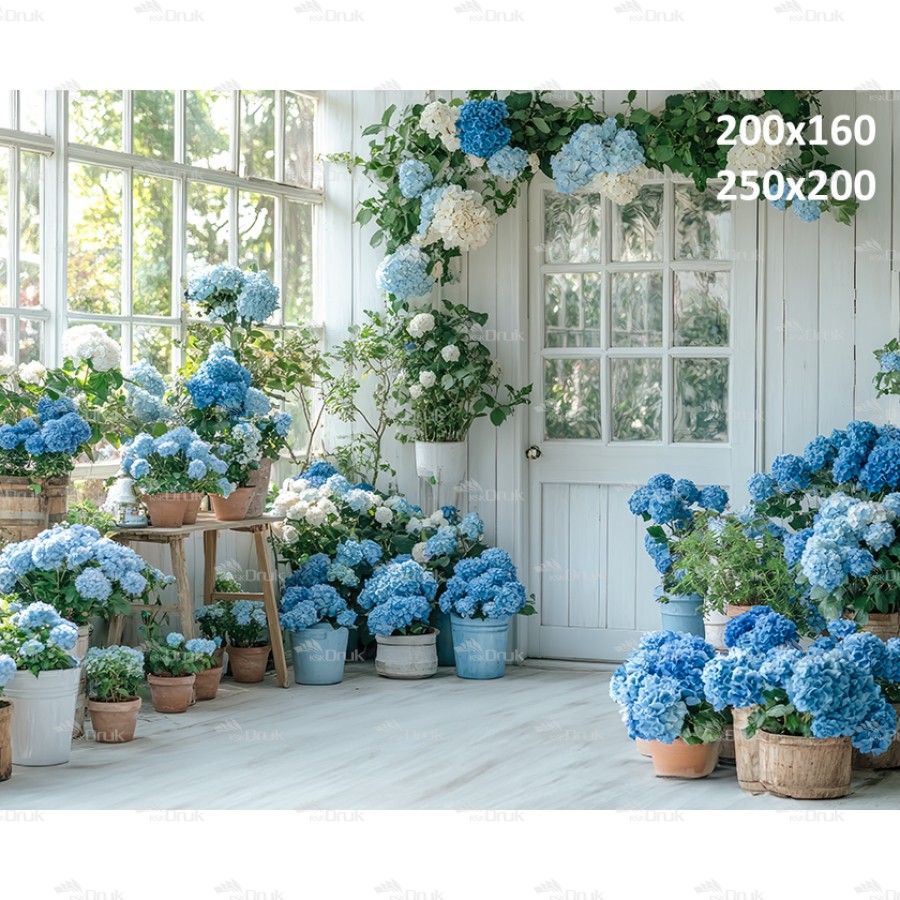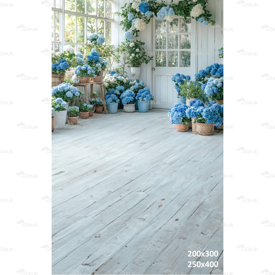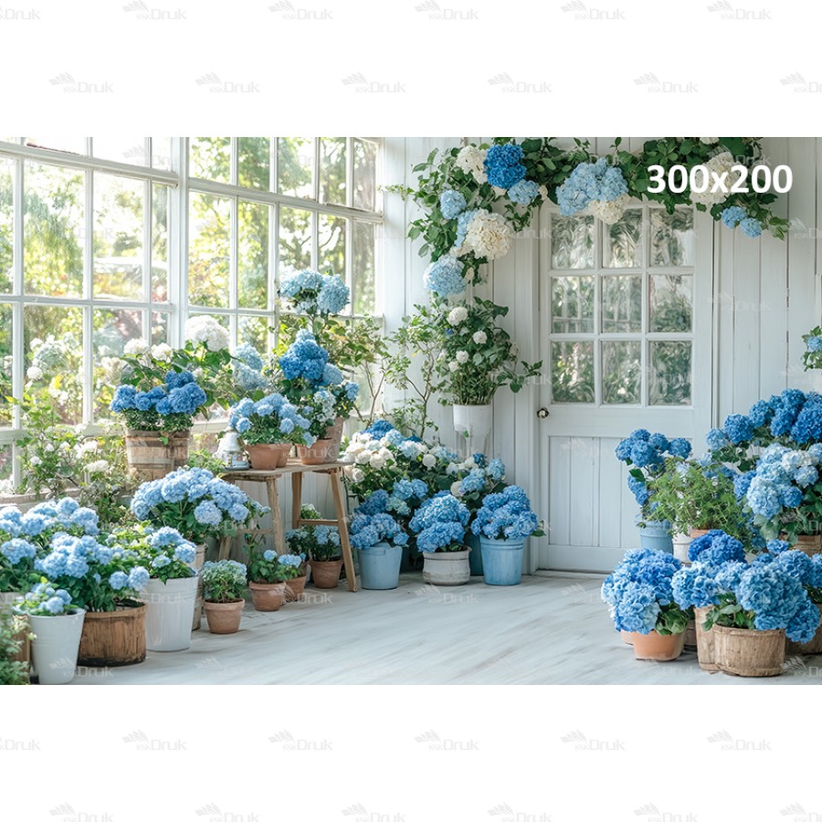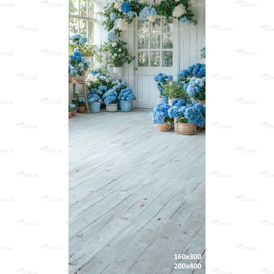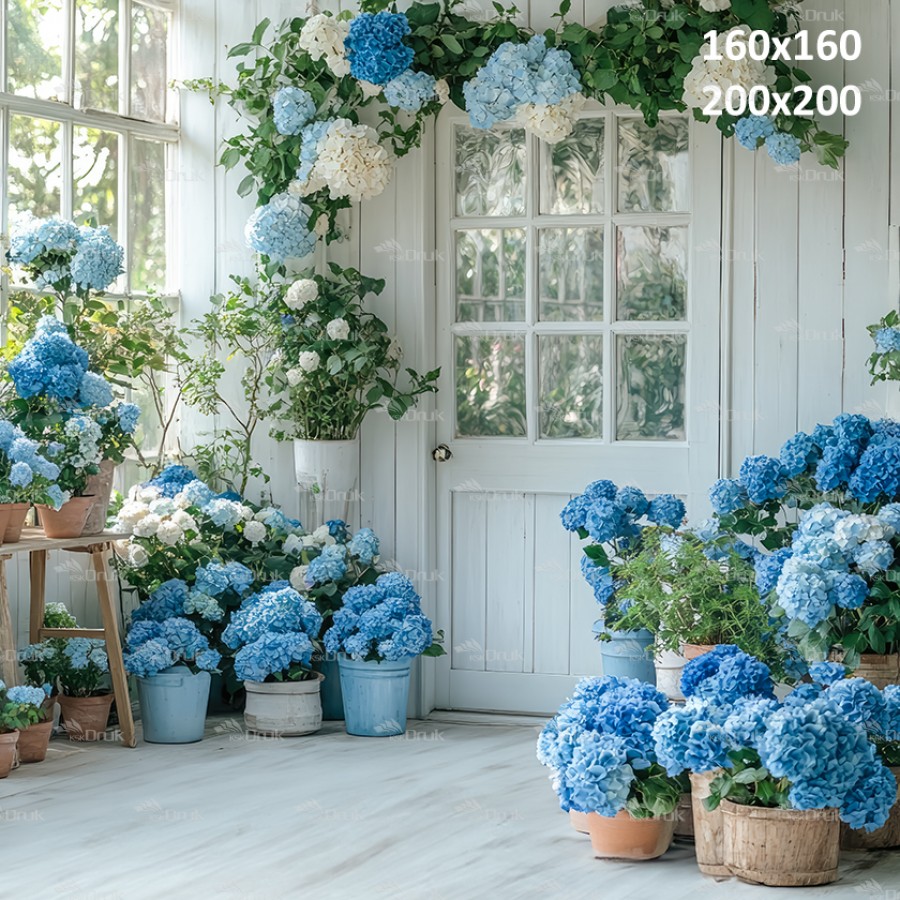Tagi: Tło fotograficzne E345, tło wiosenne, wiosna, dzień babci, dzień dziadka, dzień matki, sesja kobieca, okno, drzwi, niebieskie kwiaty, hortensje, doniczki, girlanda z kwiatów, biały, szary