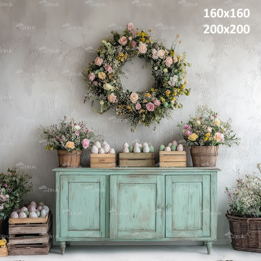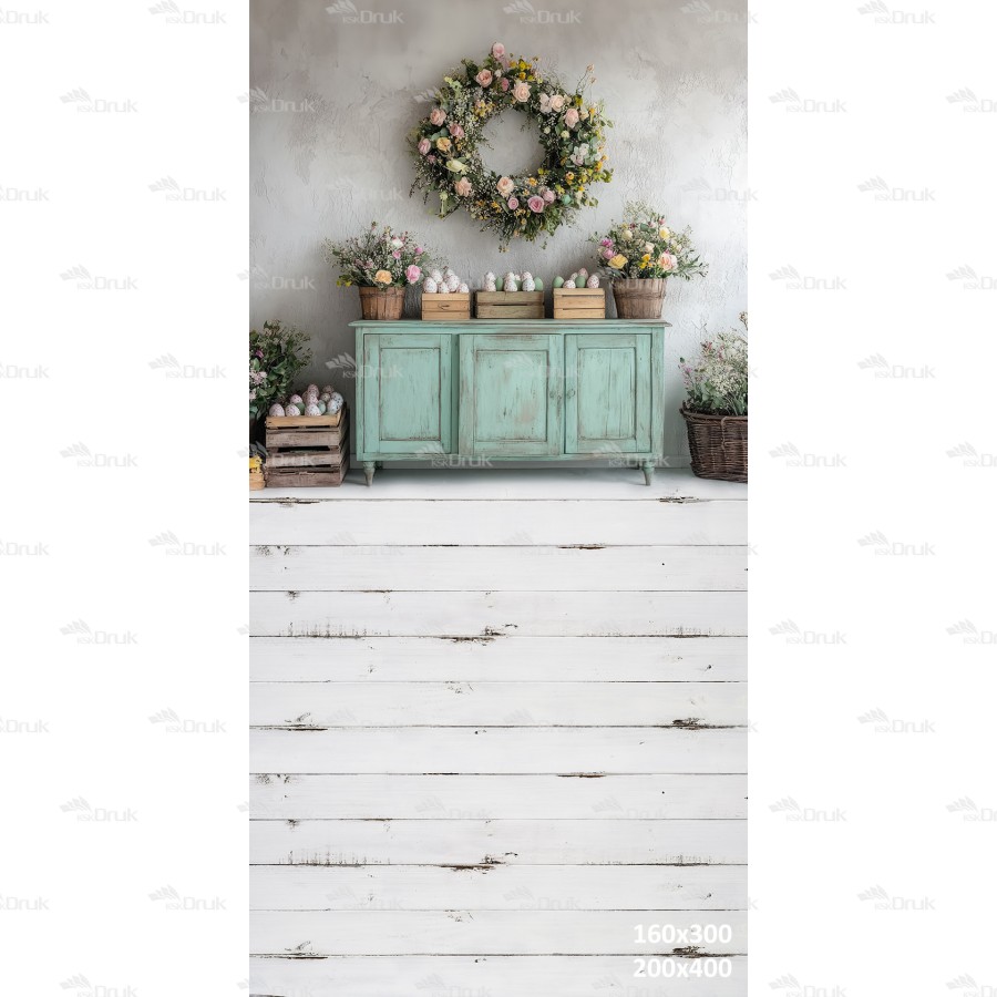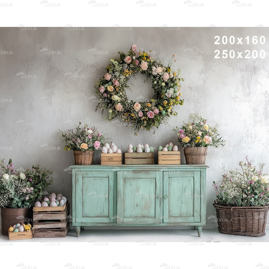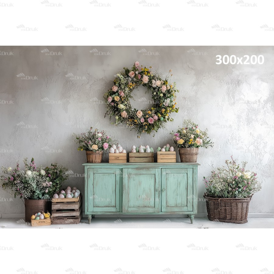 Tagi: Tło fotograficzne E401, tło wiosenne, wiosna, wielkanoc, pastelowe kolory, miętowa komoda, girlanda z kwiatów, różowe i białe kwiaty w wiklinowych koszach, kolorowe jajka w koszykach, deski