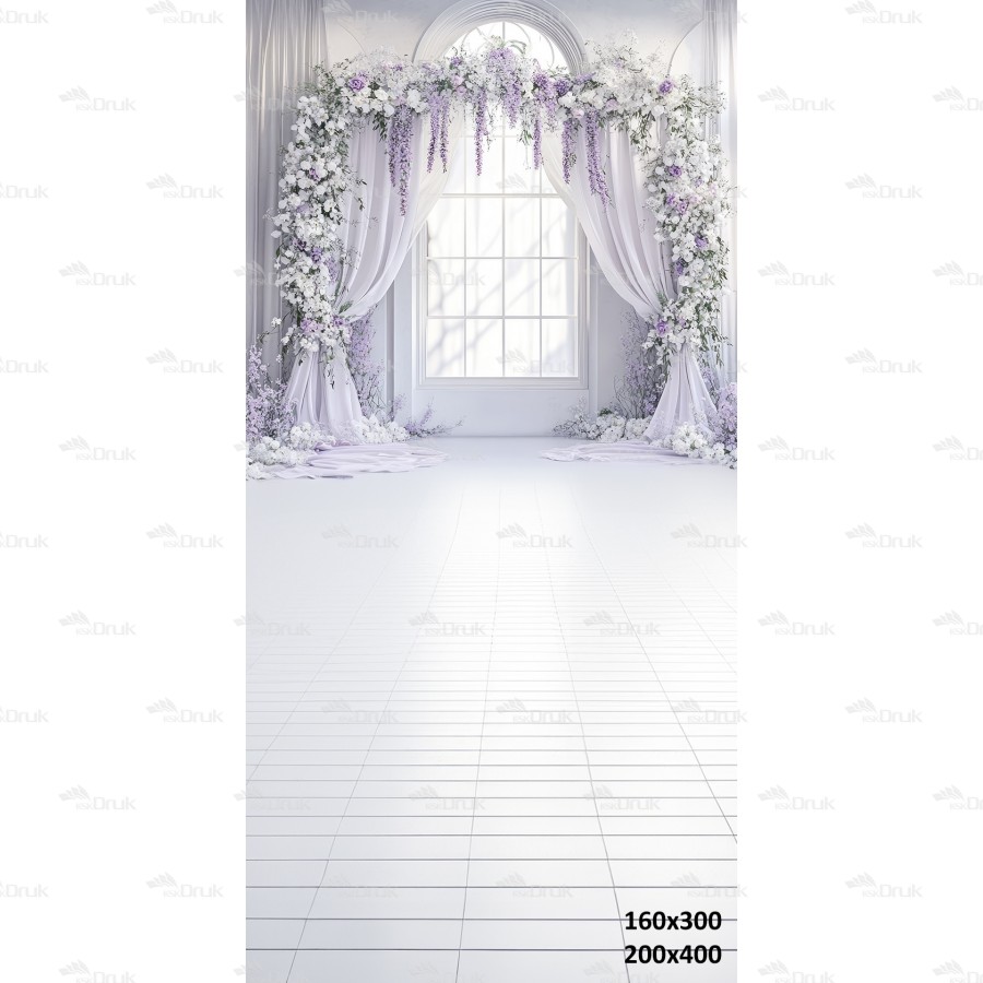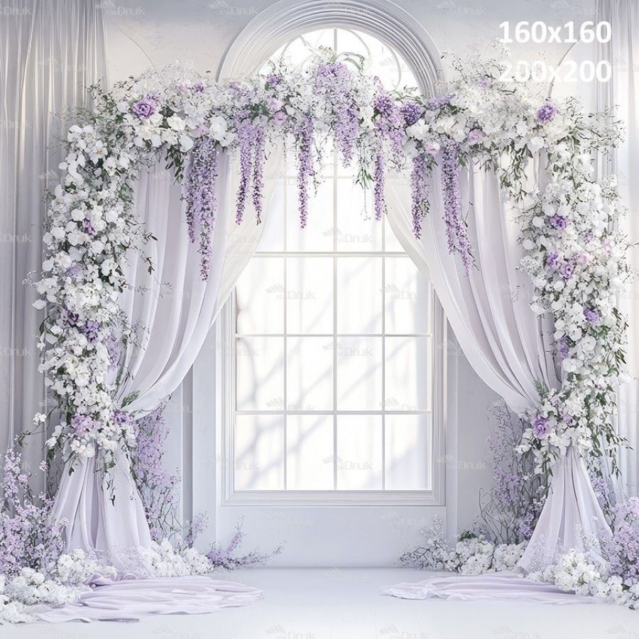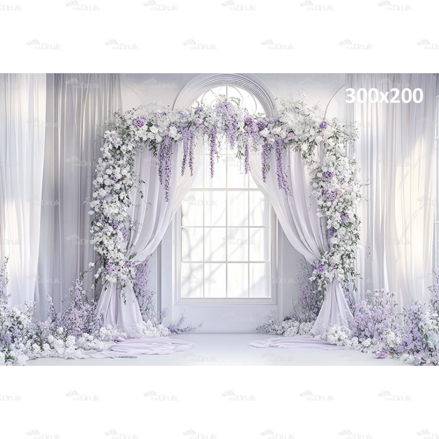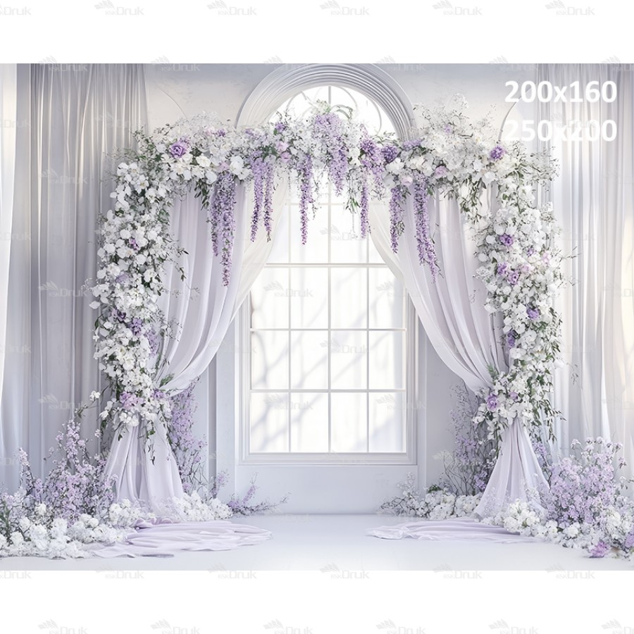 Tagi: Tło fotograficzne E522, tło wiosenne, wiosna, komunia, chrzest święty, okno z łukiem, delikatne tiulowe zasłony, girlanda z kwiatów, białe kwiaty, liliowe kwiaty, wisteria