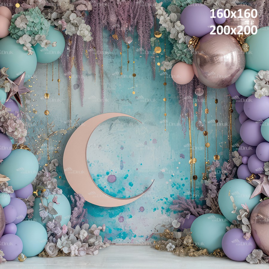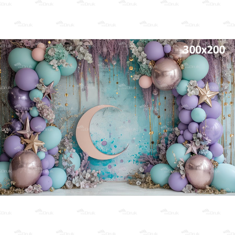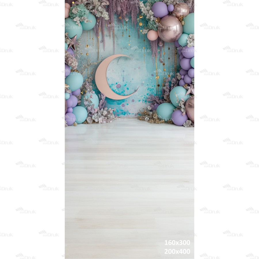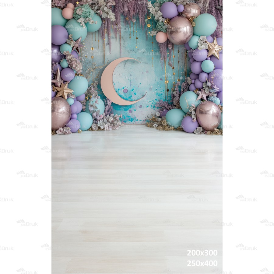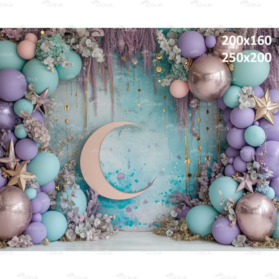 Tagi: Tło fotograficzne UB_421, tło urodzinowe, tło do sesji dziewczęcej, księżycowa wróżka, księżyc, złote gwiazdy, balony, suszone kwiaty, różowe złoto, turkusowy, fioletowy, beżowa podłoga