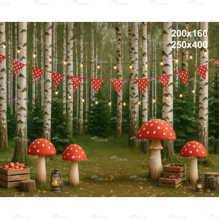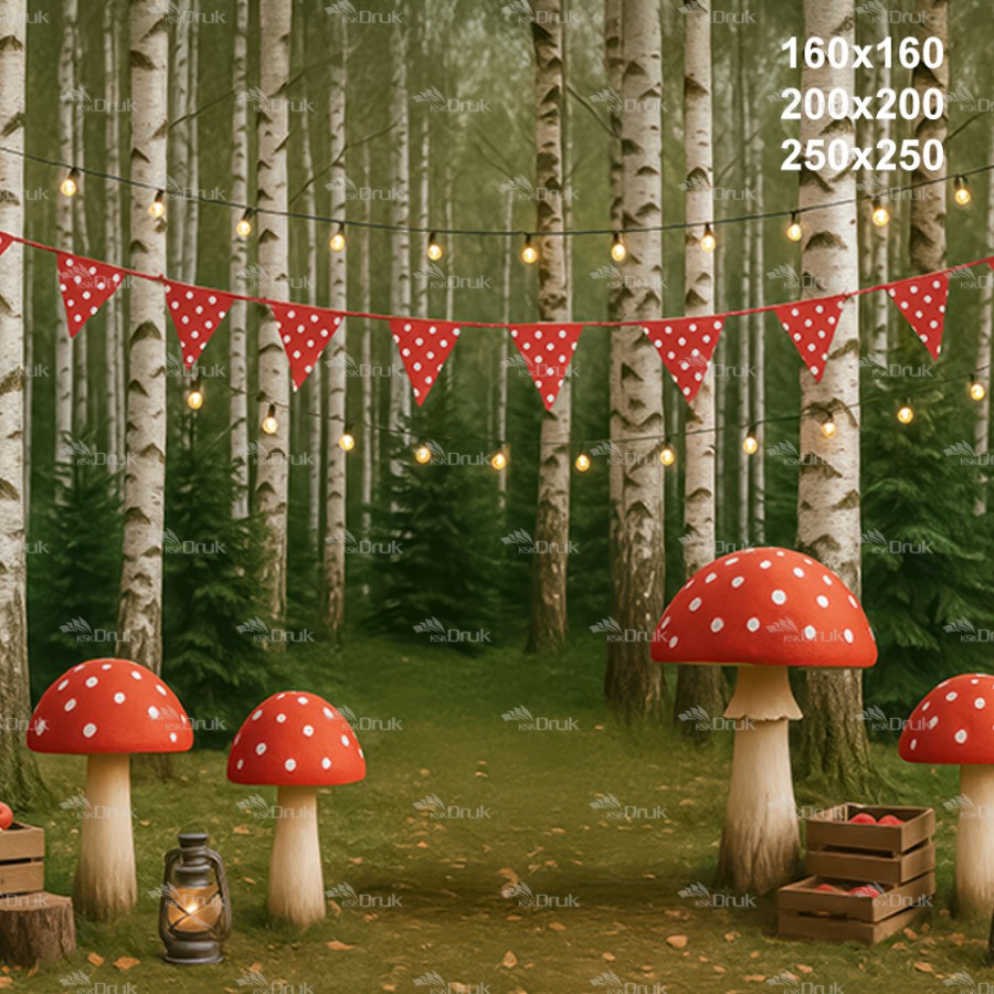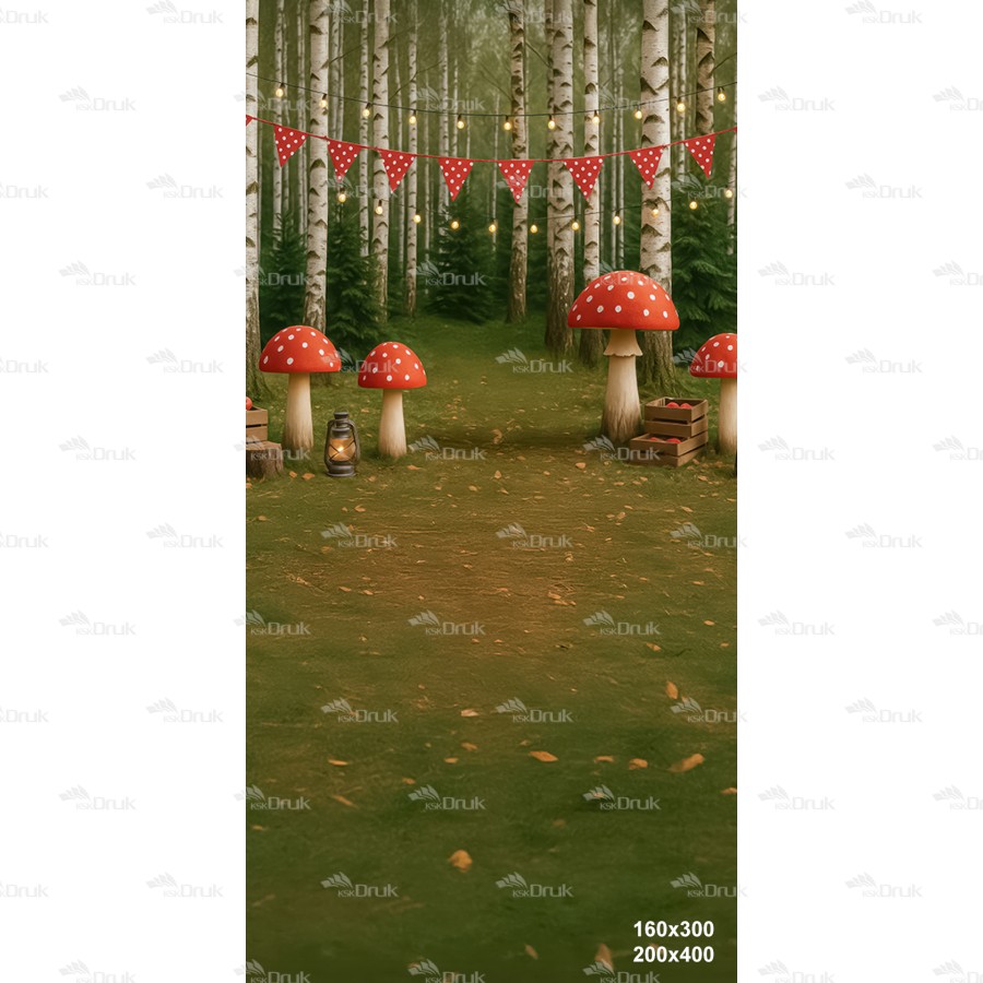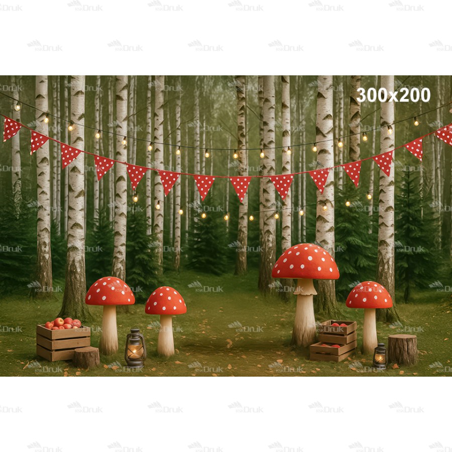Tagi: J_233, tło leśne, jesień, brzozy, girlanda w kropki, czerwone muchomory, sesja dziecięca, przedszkole, jabłka, klimat lasu, KSK DRUK
