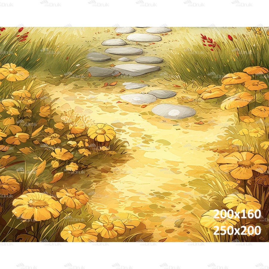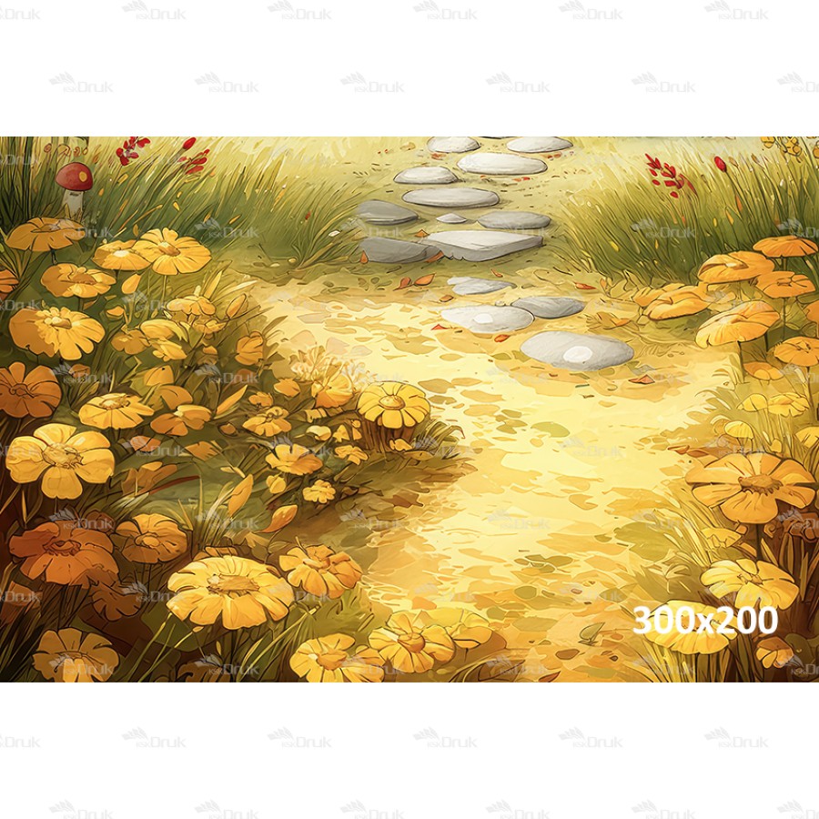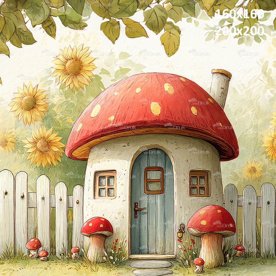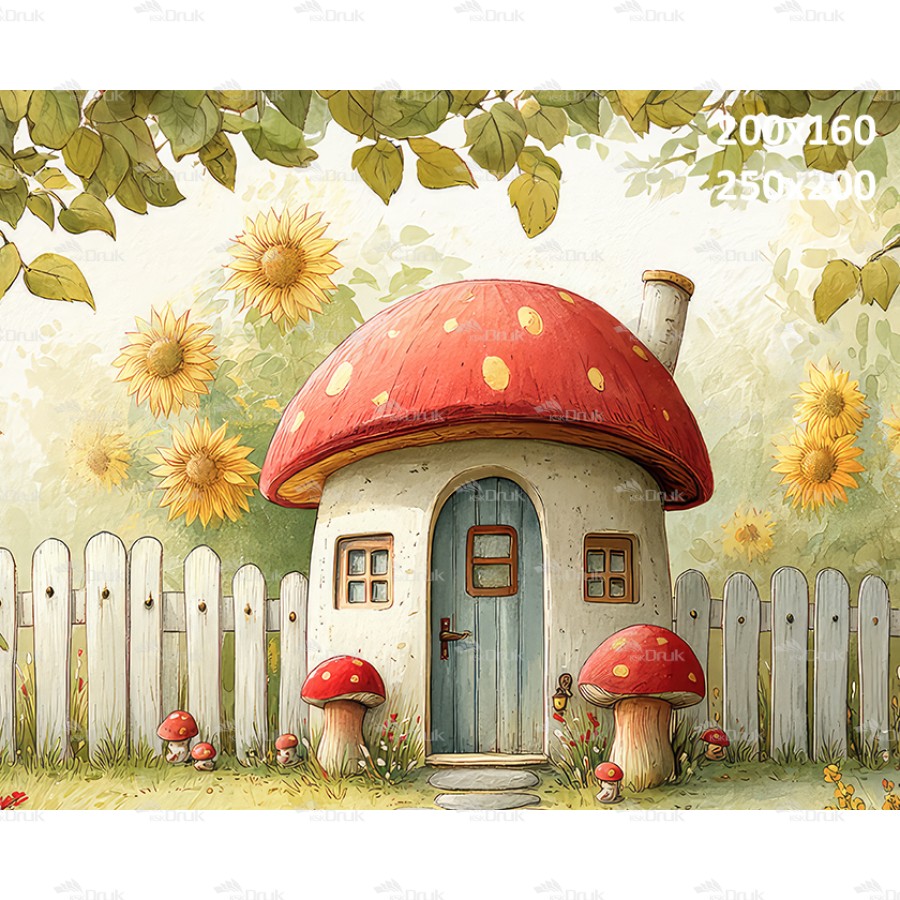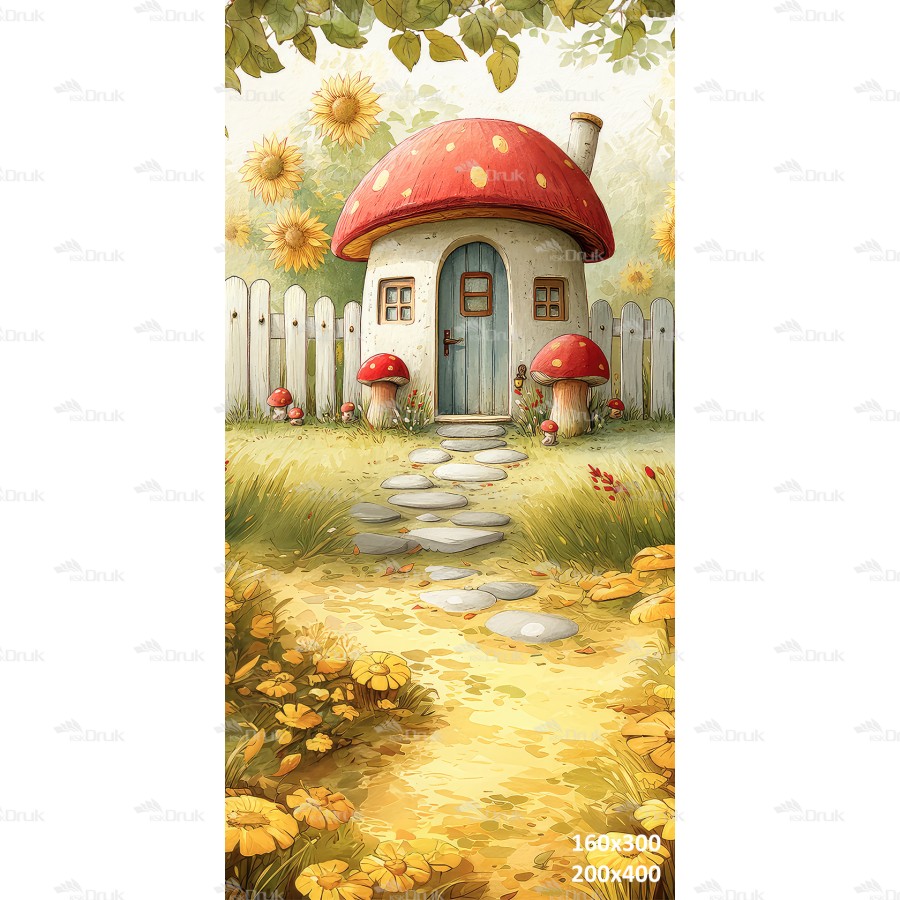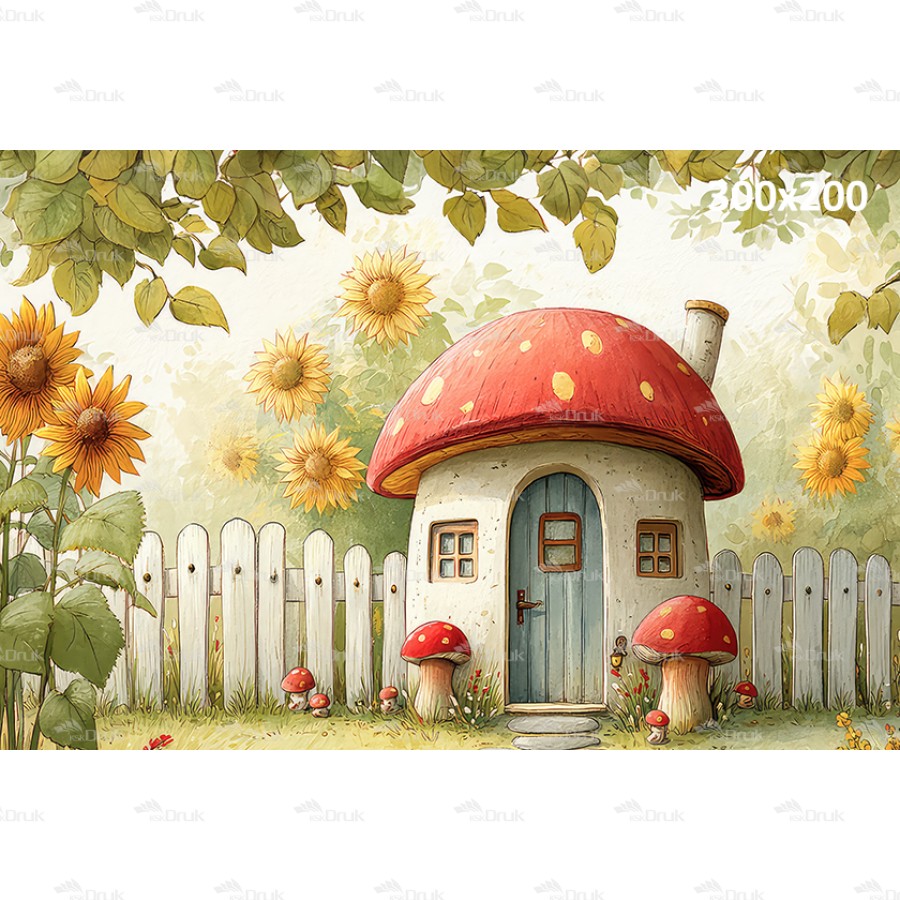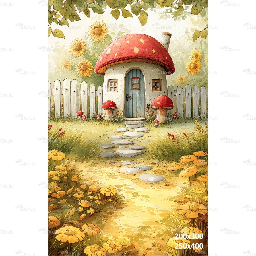 Tagi: Tło fotograficzne 3469, tło jesienne, rysowane, dziecięce, do przedszkola, do żłobka, domek w muchomorku, muchomor, biały płotek, ścieżka, słoneczniki