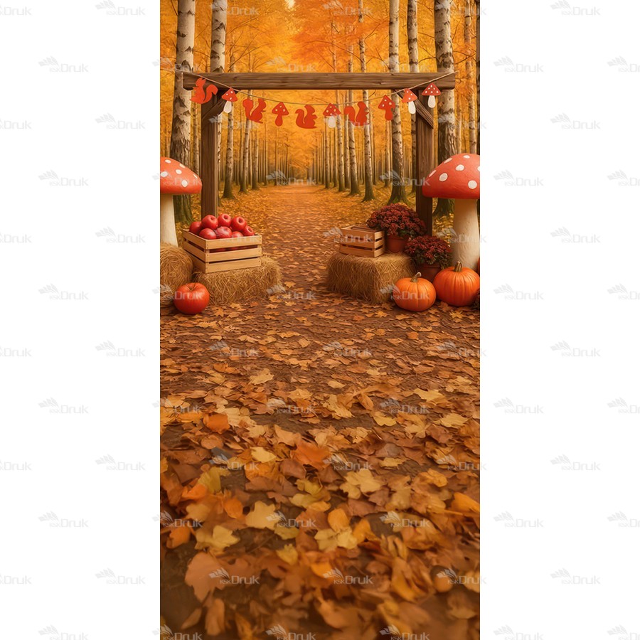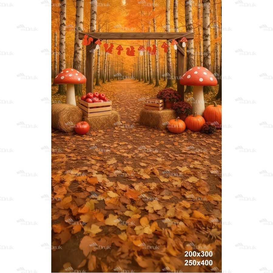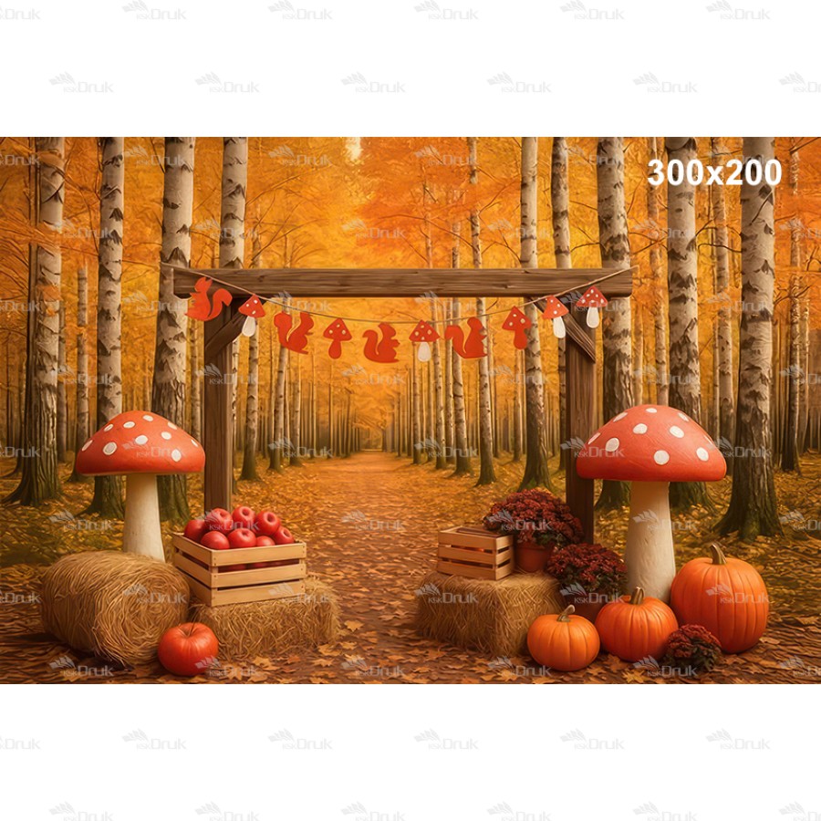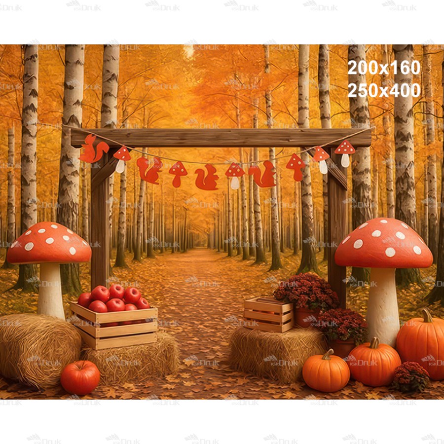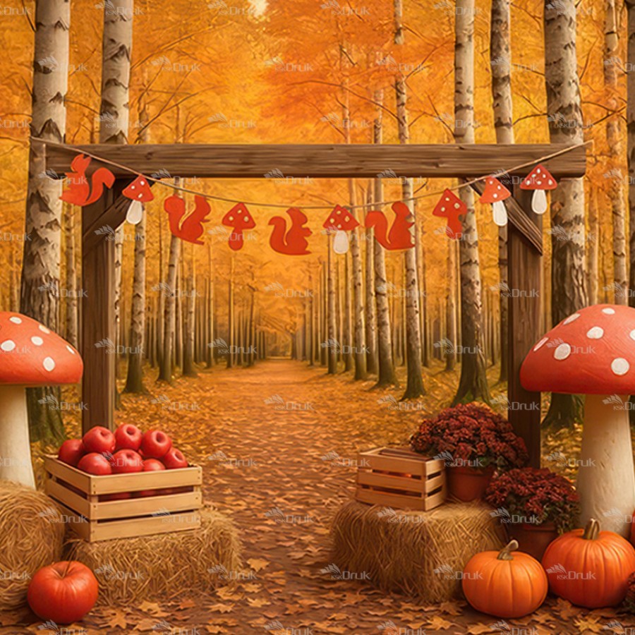 Tagi: J_231, tło jesienne, las brzozowy, sesja z dyniami, tło z muchomorami, tło z liśćmi, jabłka, wiewiórki, tło do przedszkola, KSK DRUK