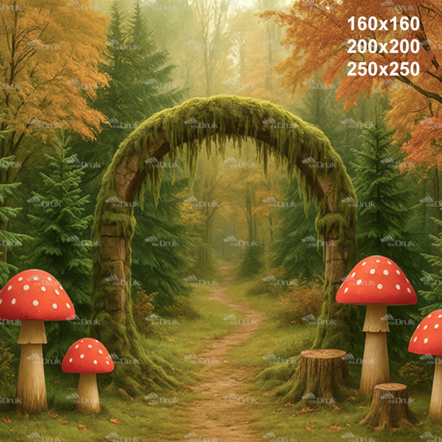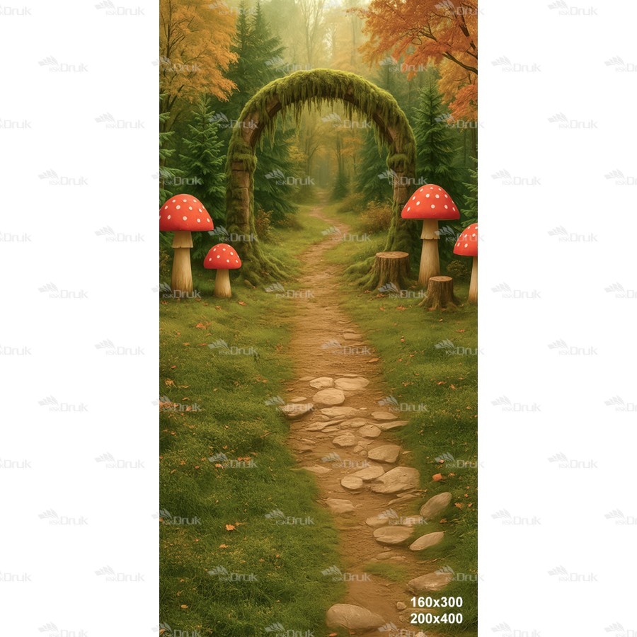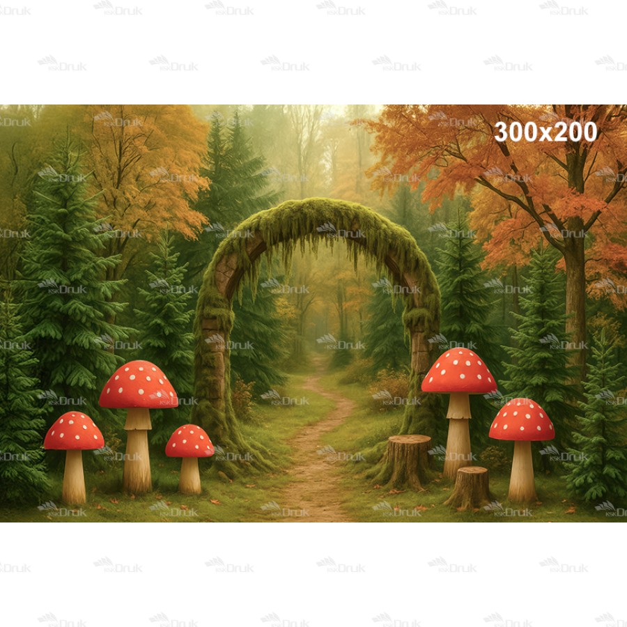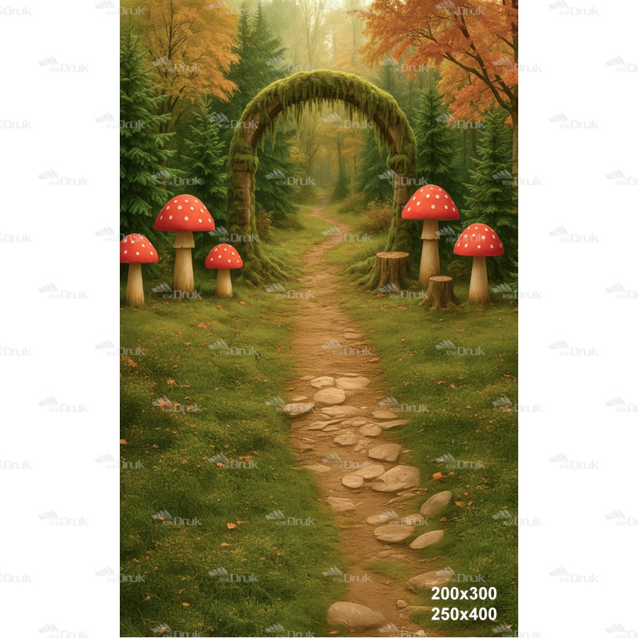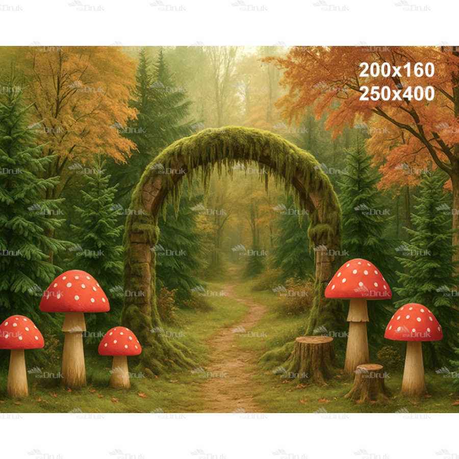 Tagi: J_229, tło leśne, tło z muchomorami, tło jesienne, ścieżka w lesie, bajkowy klimat, mchy, łuk z mchu, sesja dziecięca, sesja rodzinna, KSK DRUK
