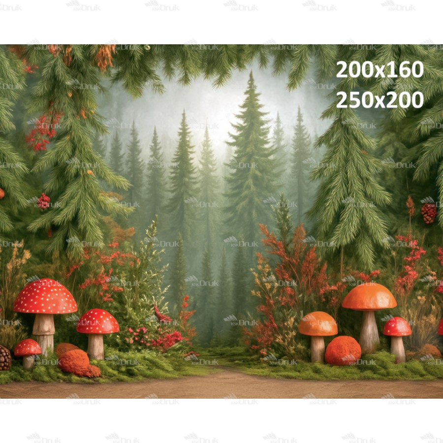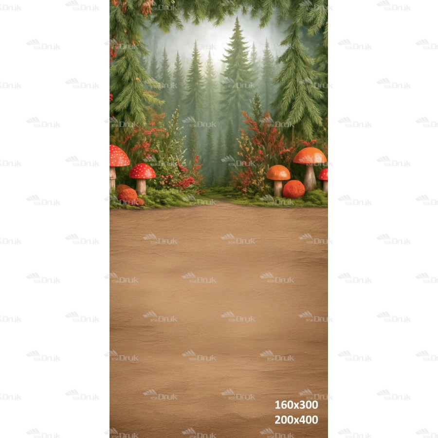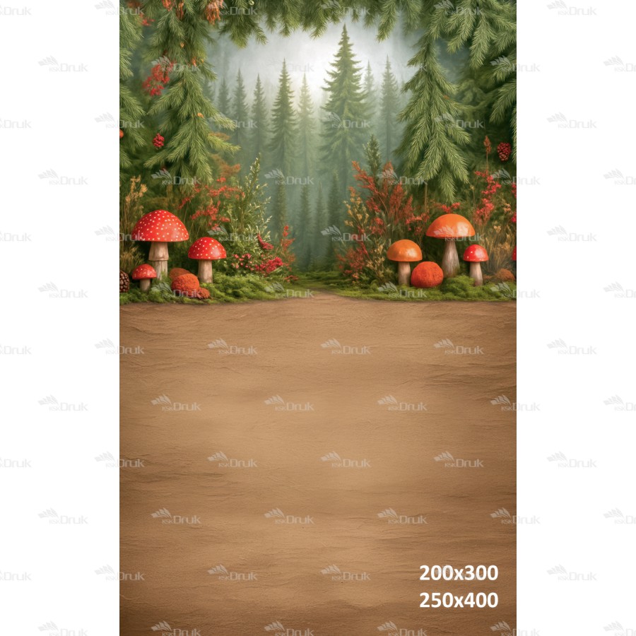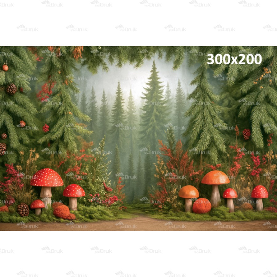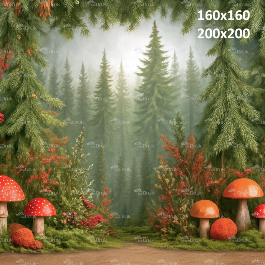 Tagi: J_237, bajkowy las, czerwone muchomory, sosny, świerki, tło fotograficzne leśne, dziecięce sesje, tło do zdjęć, KSK DRUK, grzyby leśne