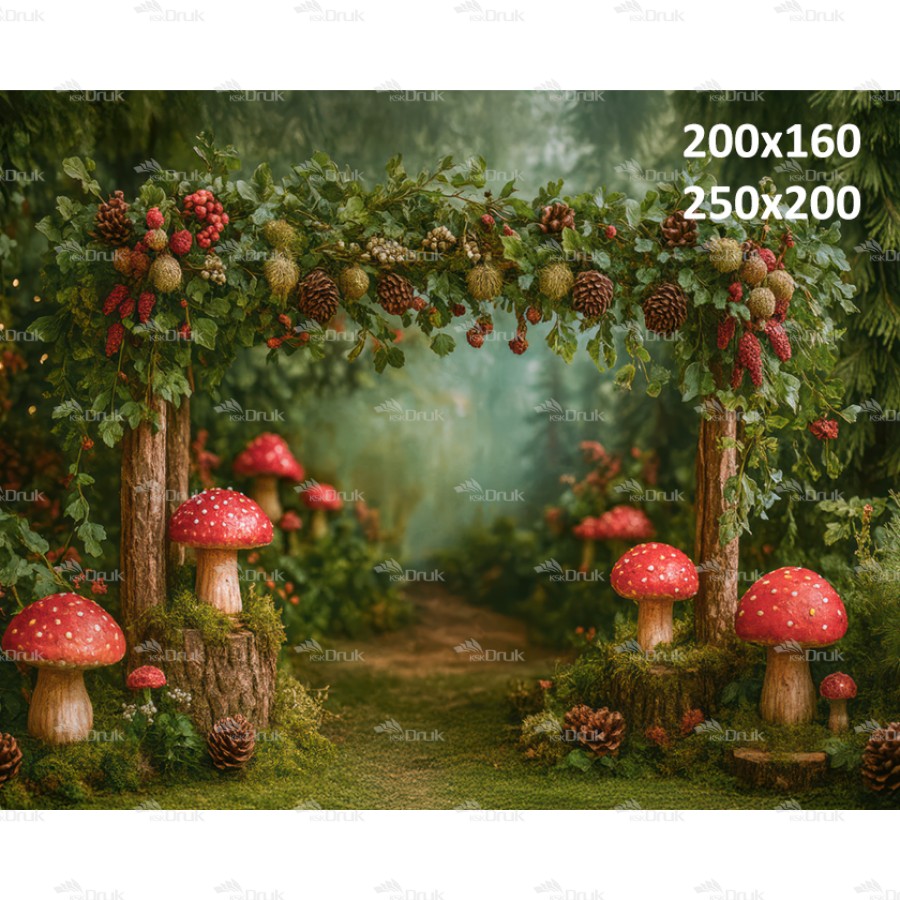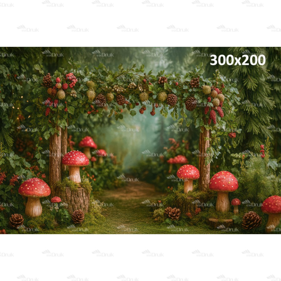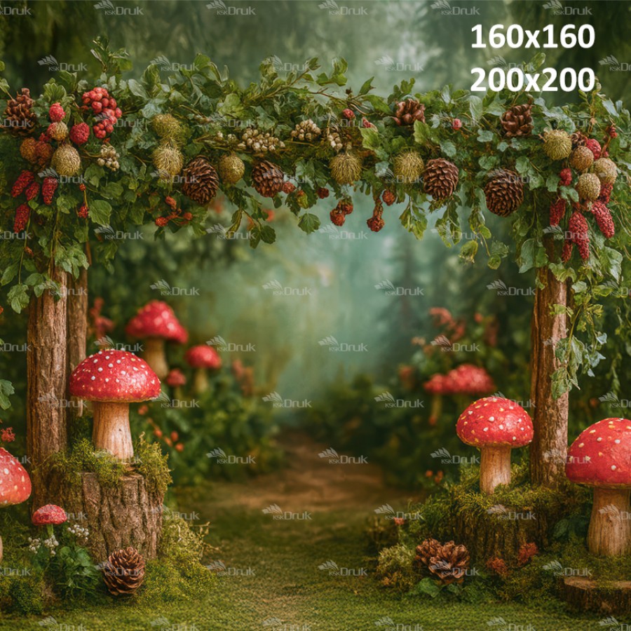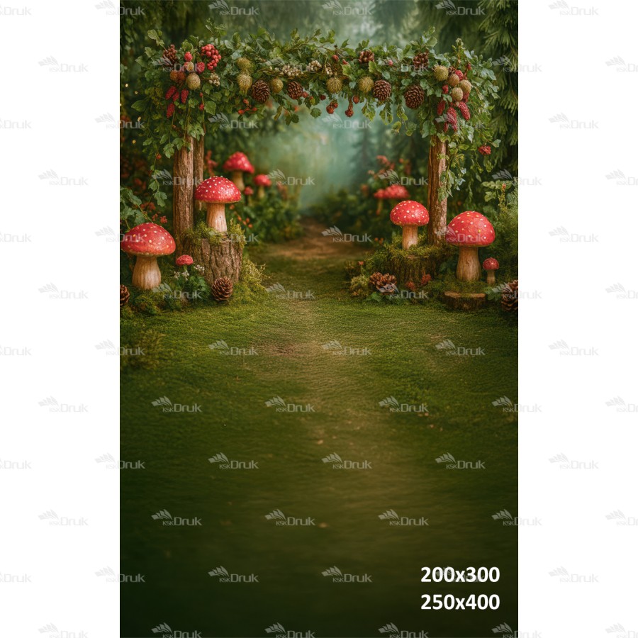 Tagi: J_235, tło leśne, bajkowy las, grzyby, muchomory, runo leśne, dziecięca sesja, natura, zieleń i czerwień, leśna scenografia, KSK DRUK