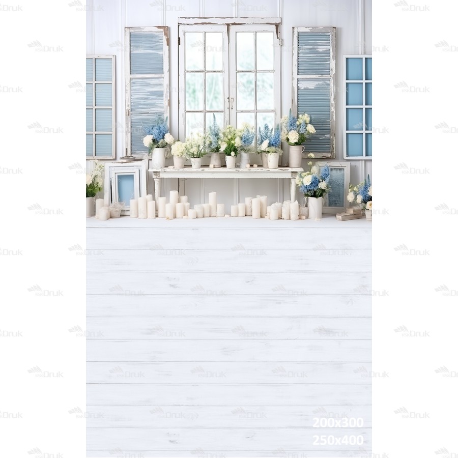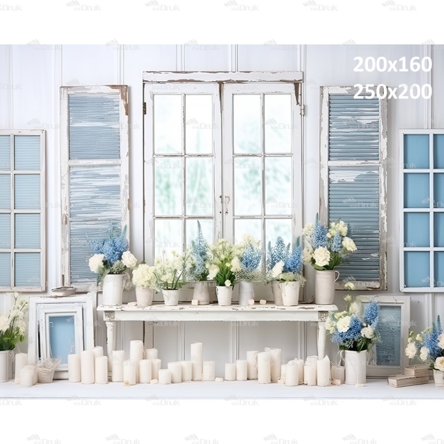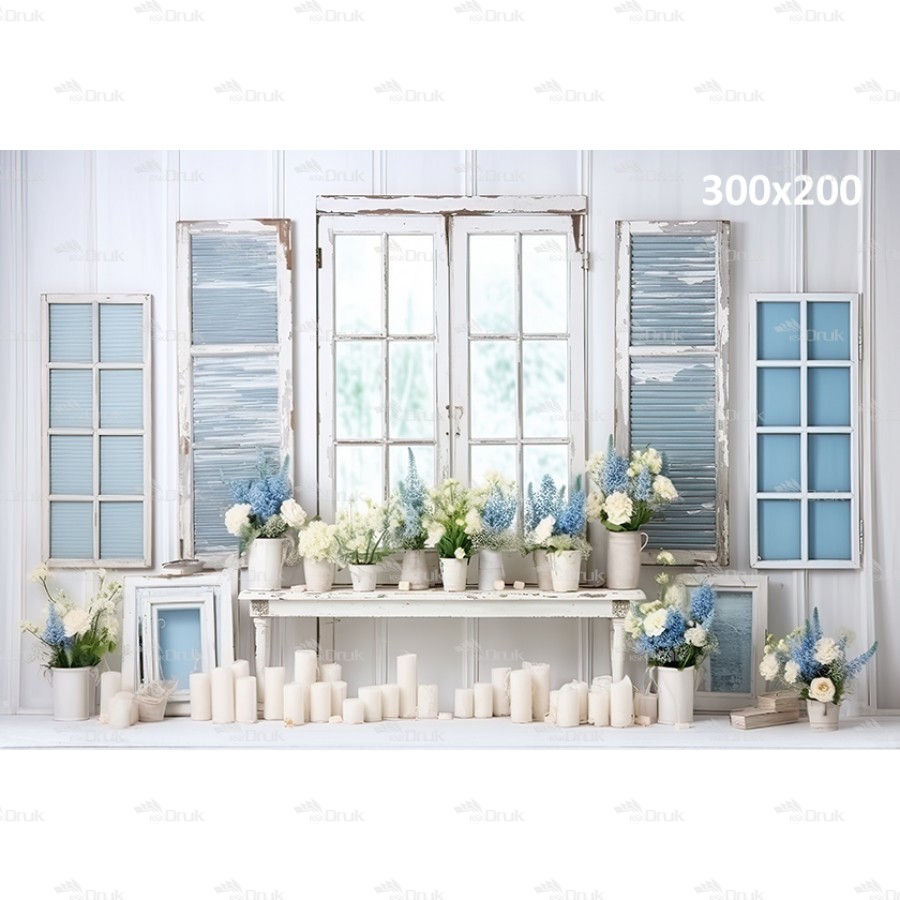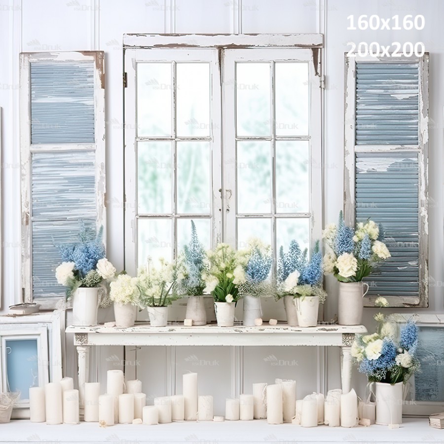 Tagi: Tło fotograficzne D_36 dzień babci, dzień dziadka, okno, ramy okienne, okiennice, shabby chic, wazony z kwiatami, kwiaty, świece, kremowy, zielony, błękitny kolor, odcienie niebieskiego, jasna drewniana podłoga, deski
