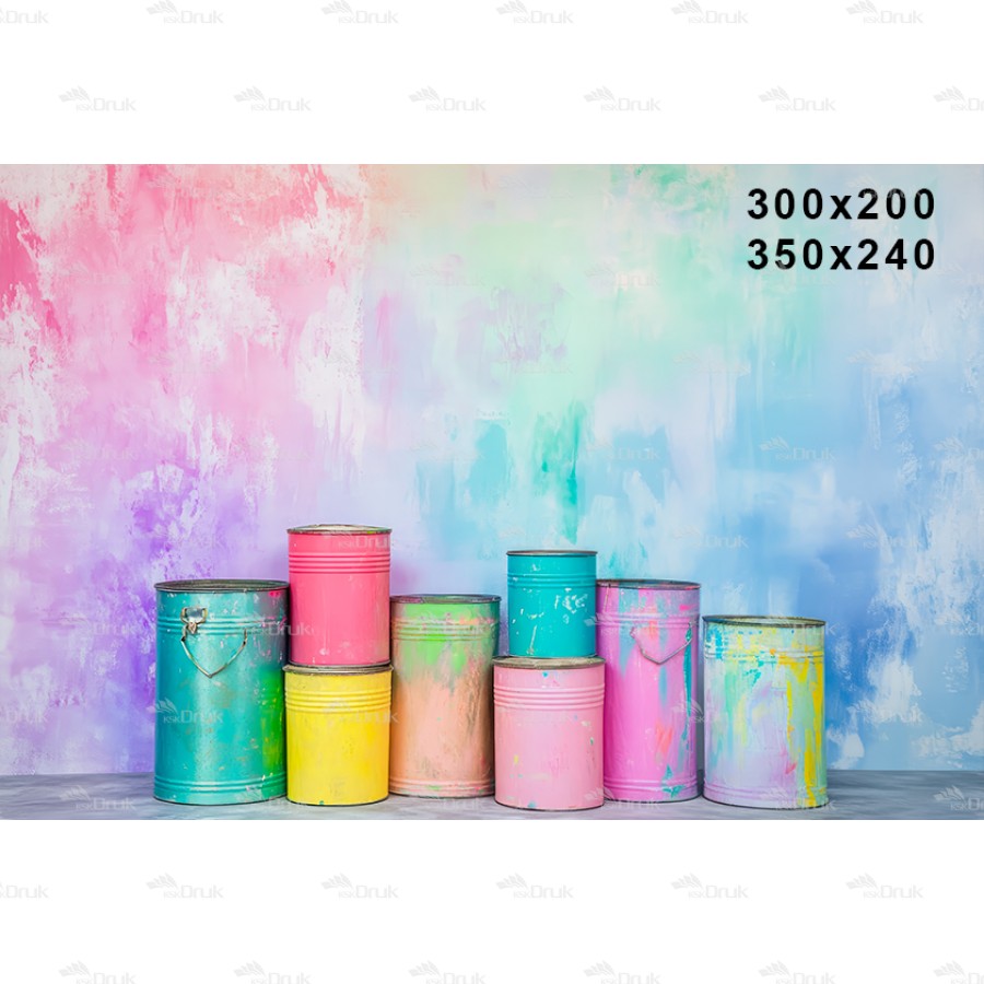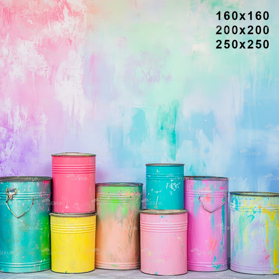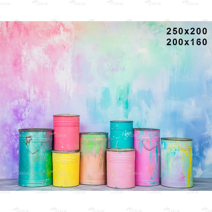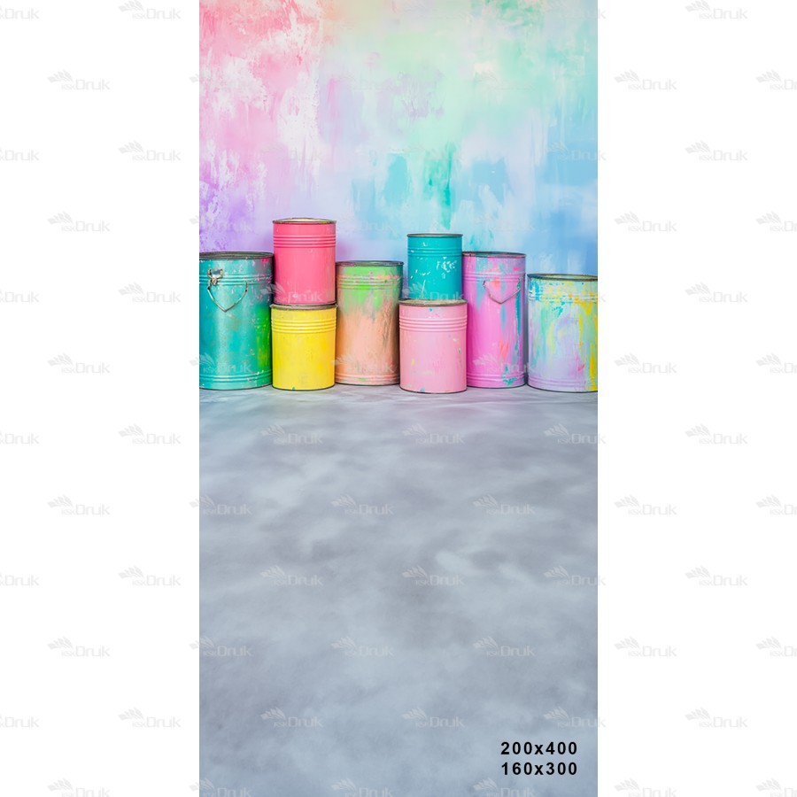 Tagi: Tło fotograficzne 3319, tło urodzinowe, młodzieżowe, ściana wielokolorowa, kolorowe beczki po farbach, pastelowe kolory