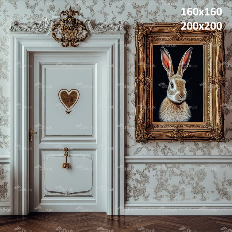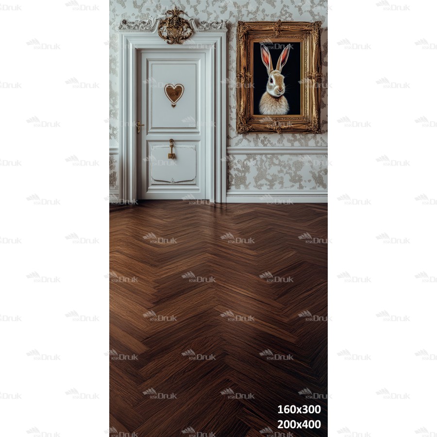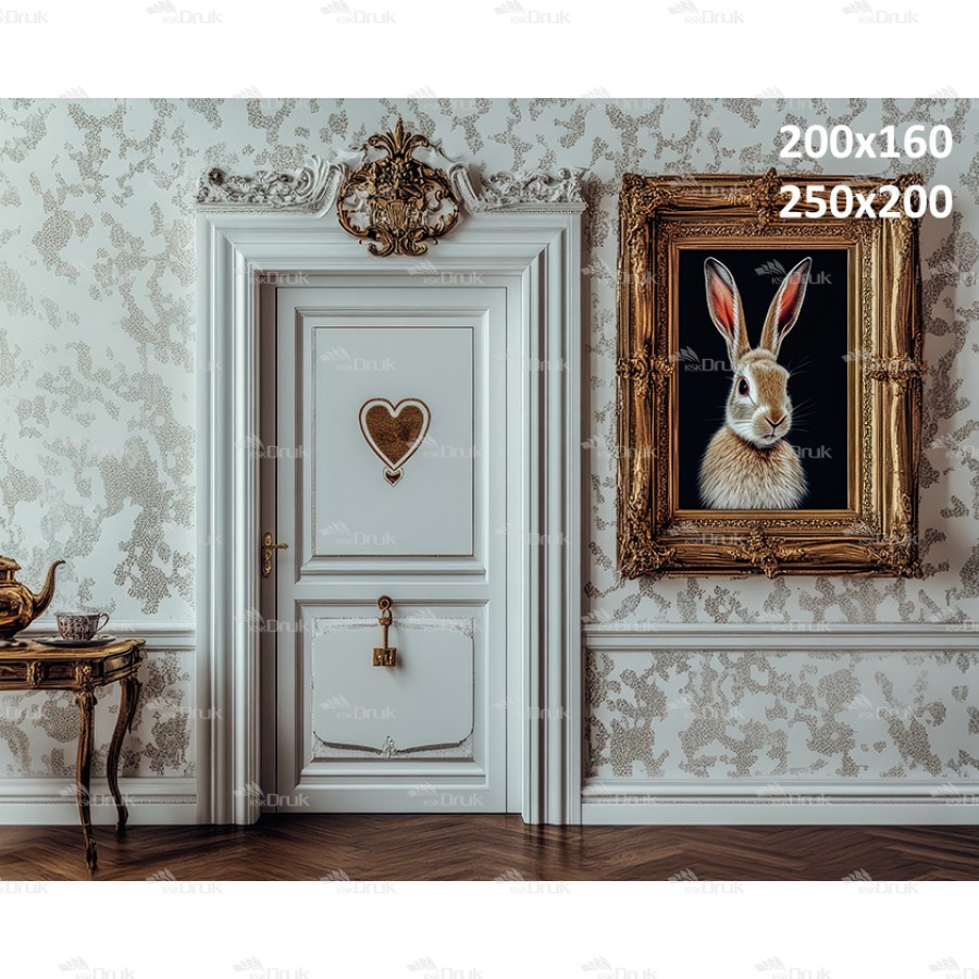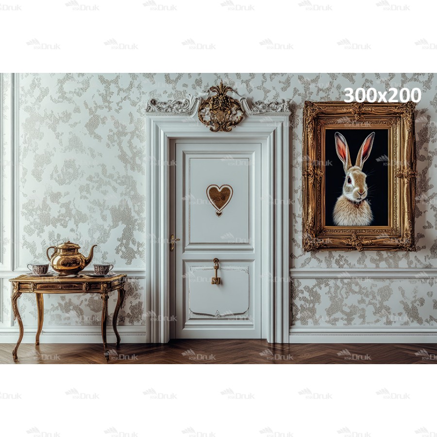 Tagi: Tło fotograficzne 3344, tło urodzinowe, Alicja w krainie czarów, złota rama, drzwi, imbryk, filiżanki, tapeta, jodełka