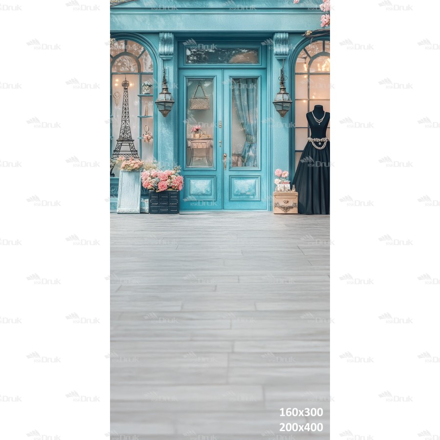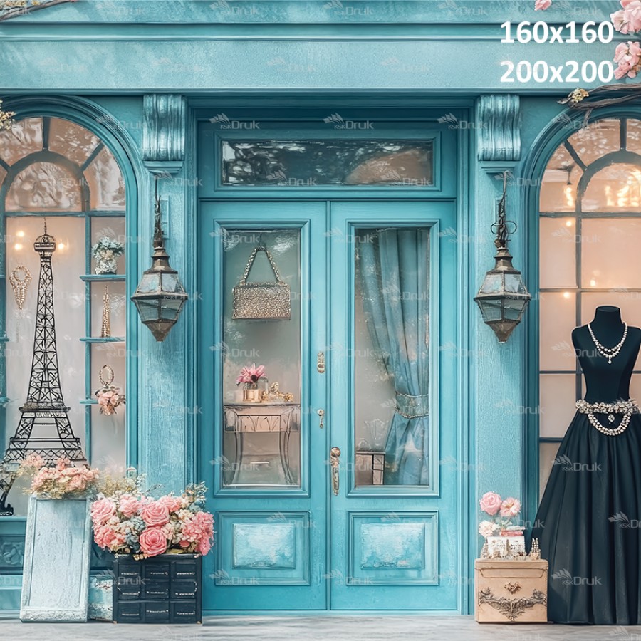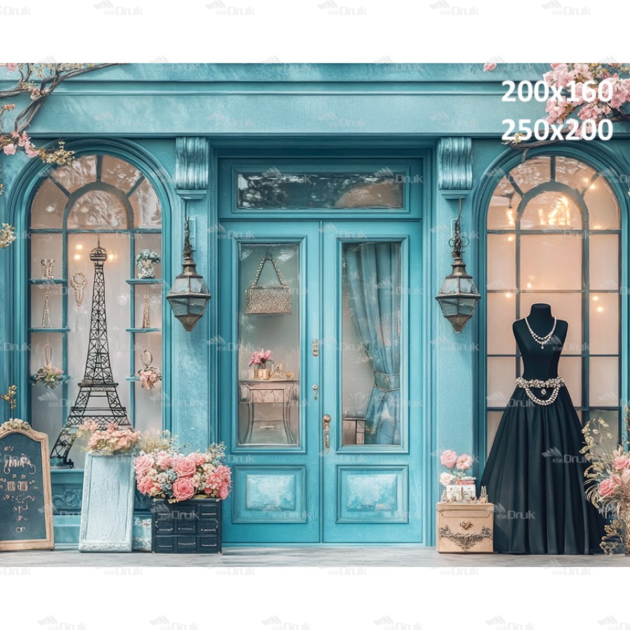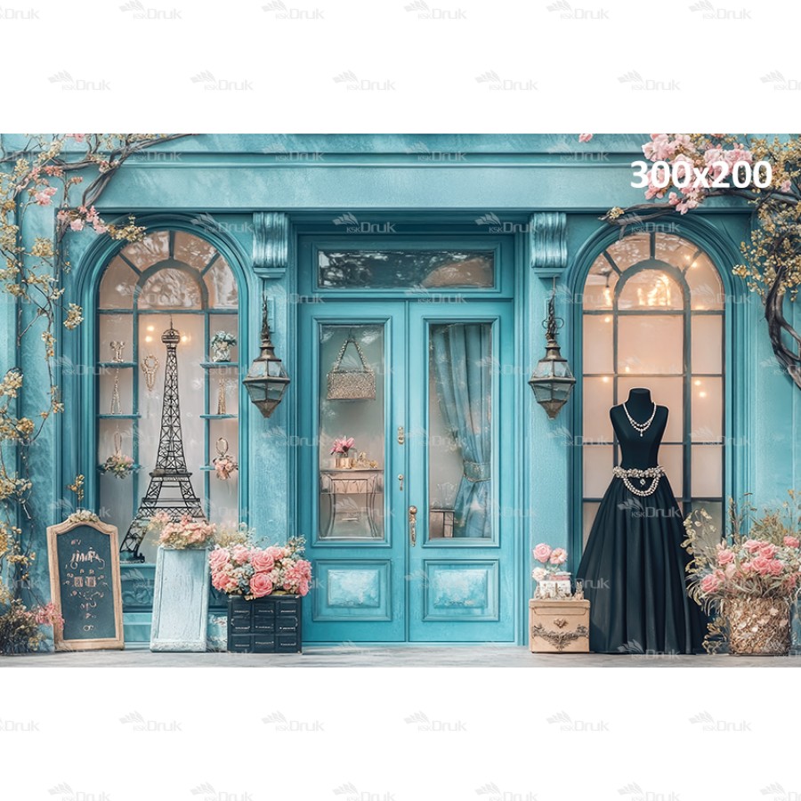 Tagi: Tło fotograficzne 3491, tło urodzinowe, sklepowa witryna, paryski butik, paryż, wieża eiffla, manekin, suknia, kwiaty