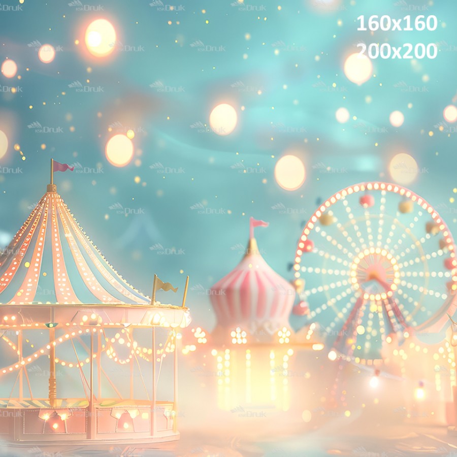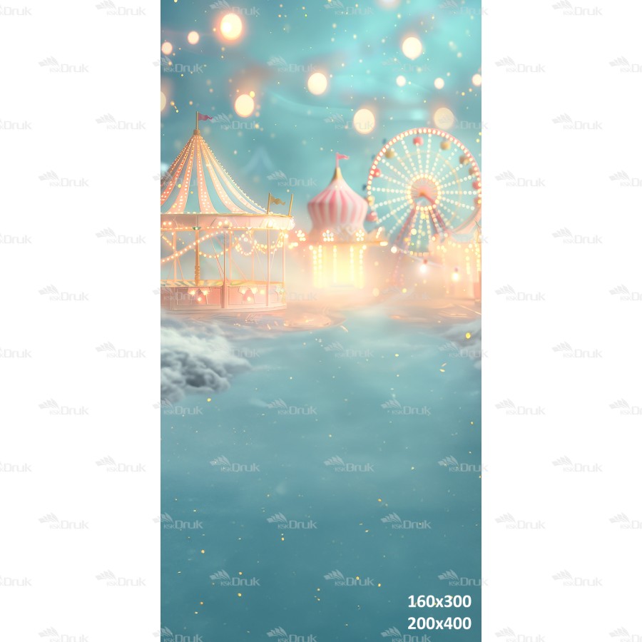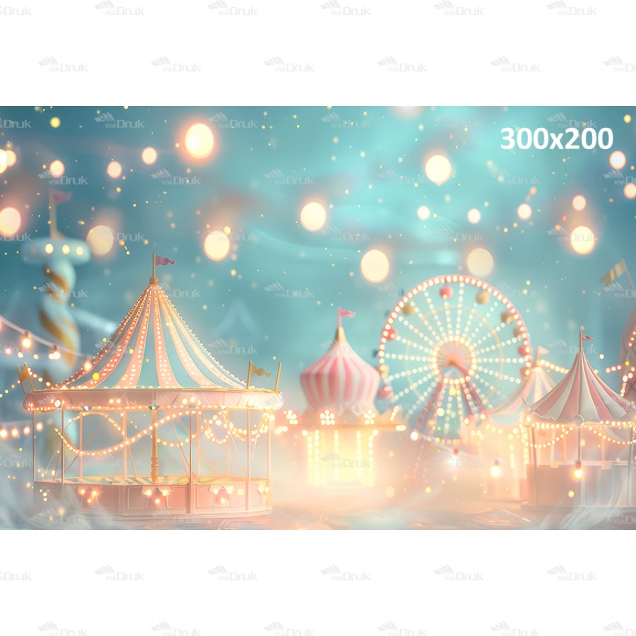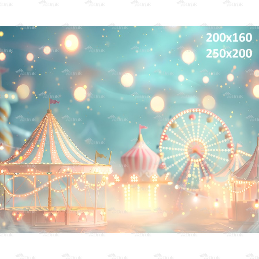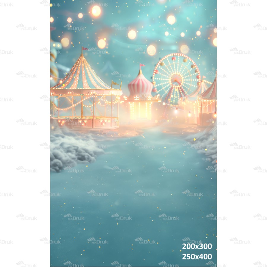 Tagi: Tło fotograficzne 2981, tło dziecięce, do przedszkola, dla chłopca, dla dziewczynki, wesołe miasteczko, karuzela, diabelski młyn, kolorowe namioty, lampki