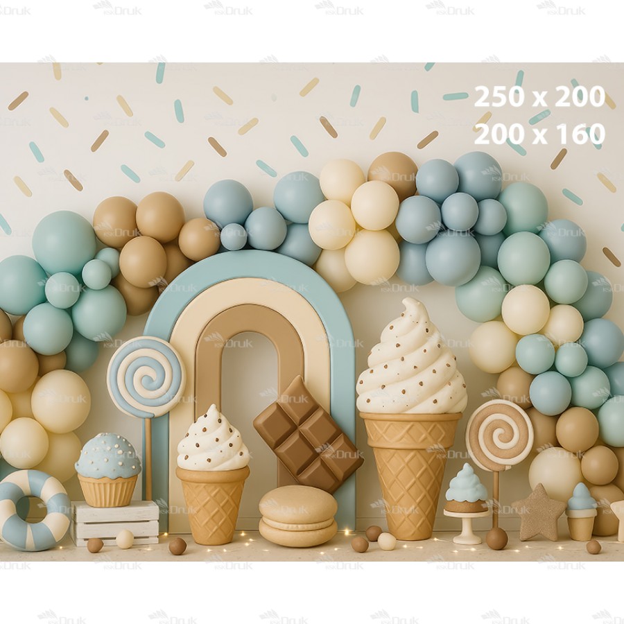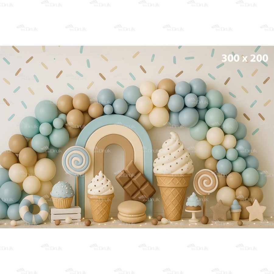 Tagi: Tło fotograficzne 3537, tło urodzinowe, słodycze, balony, lody, lizaki, ciastka, makaroniki, czekolada, tło uniwersalne, tło dla chłopca, błękitny, beżowy, brązowy