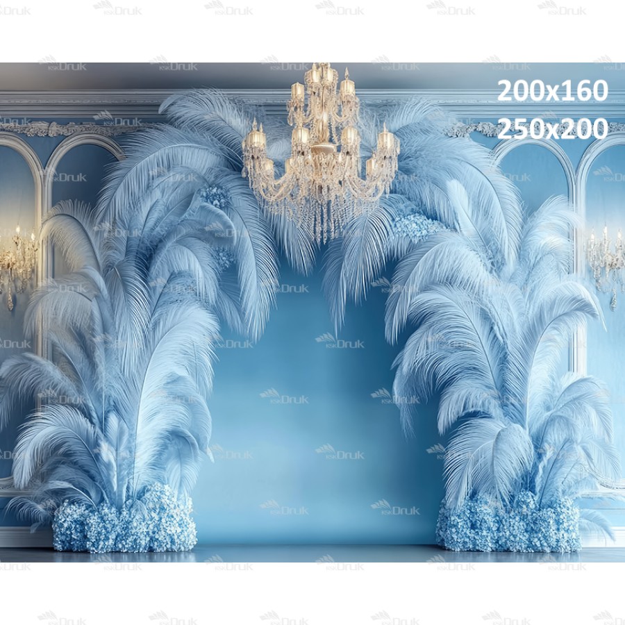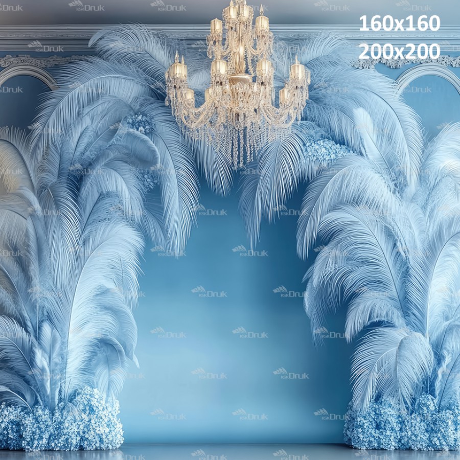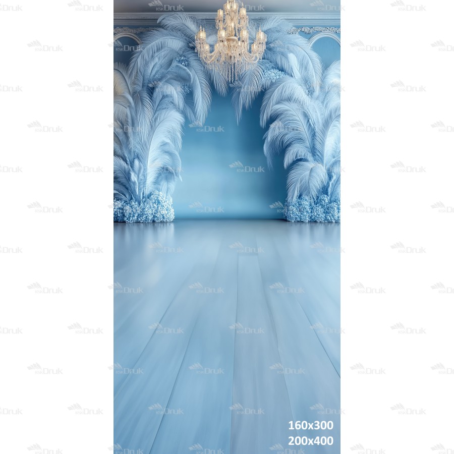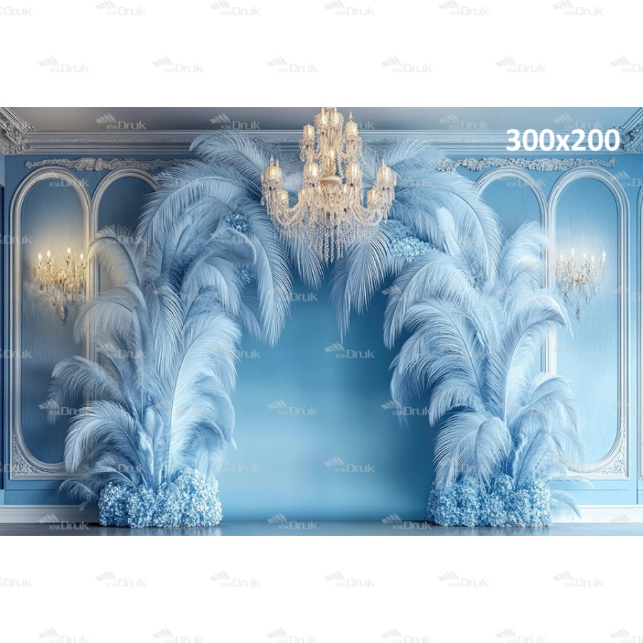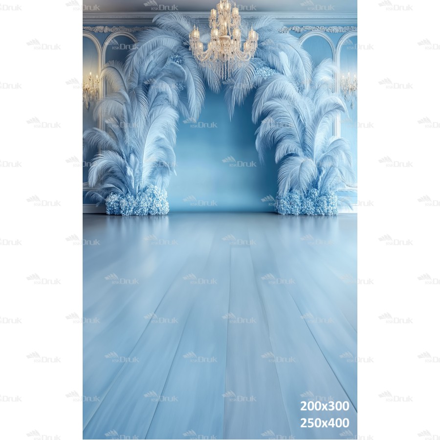 Tagi: Tło fotograficzne K_149, karnawał, sylwester, impreza, zabawa, wnętrze w stylu wiktoriańskim, łuk, ornamenty, bogato zdobiony żyrandol, glamour, błękitne pióropusze