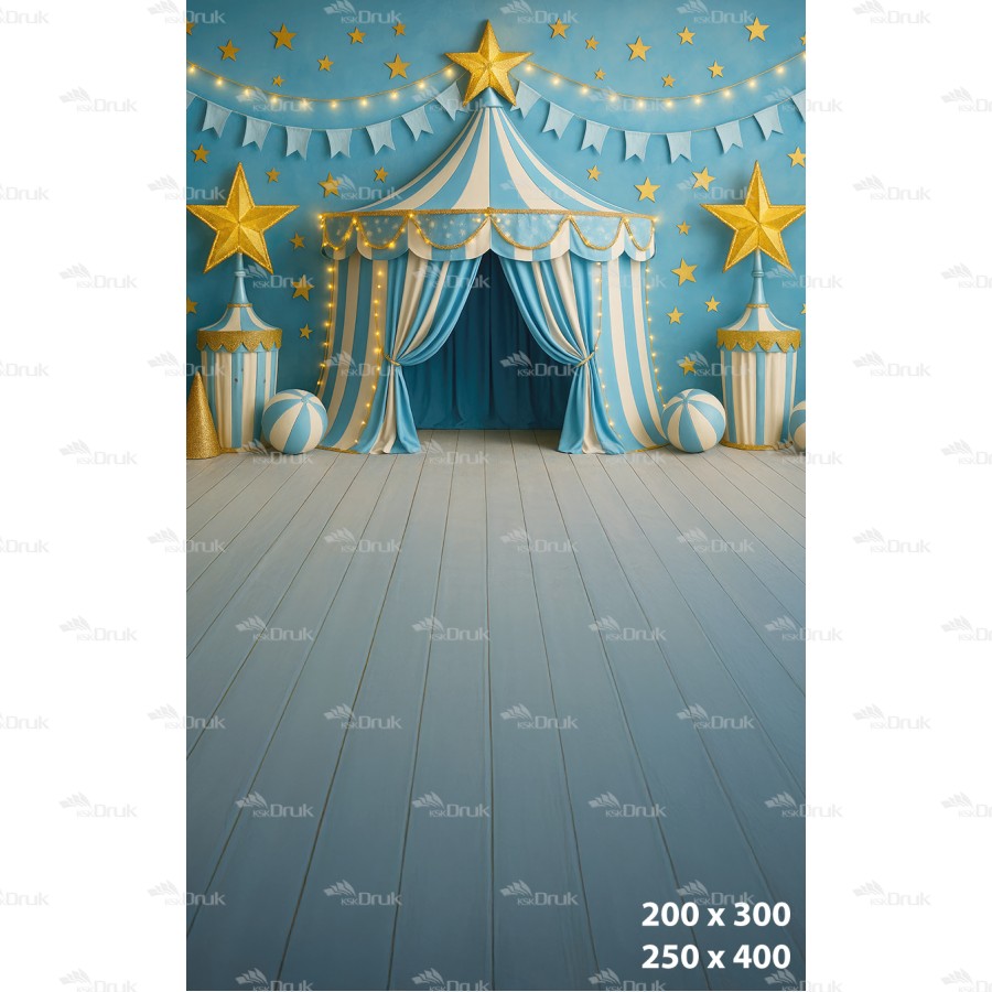 Tagi: tło karnawałowe; tło cyrkowe; błękit i złoto; namiot; gwiazdy; girlandy świetlne; dekoracja eventowa; tło dziecięce; tło urodzinowe; backdrop circus; ścianka fotograficzna; KSK DRUK; K_183