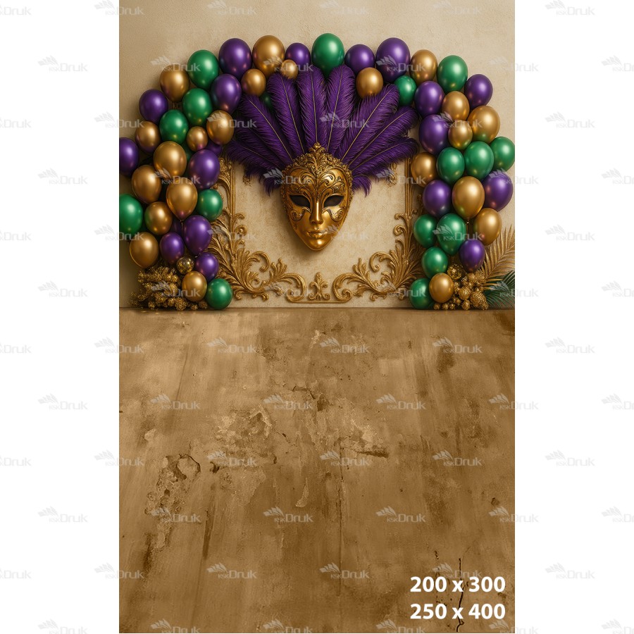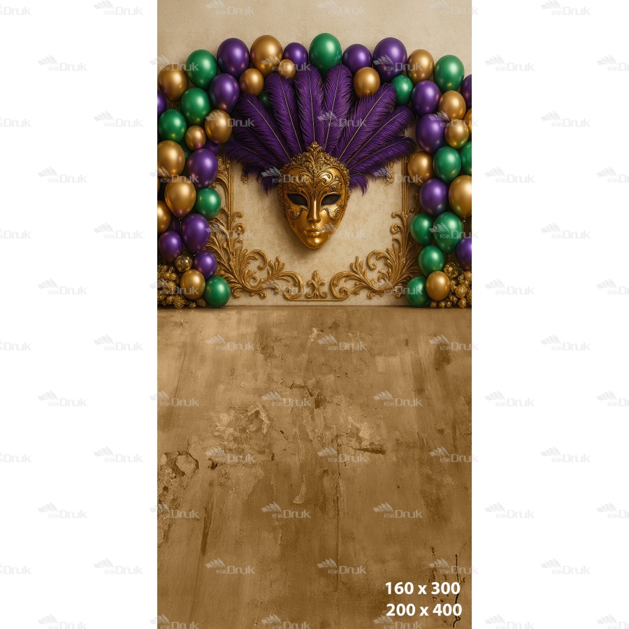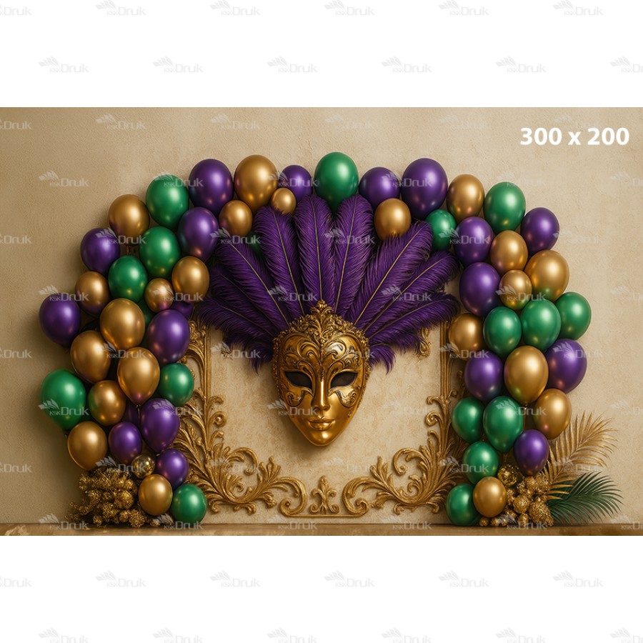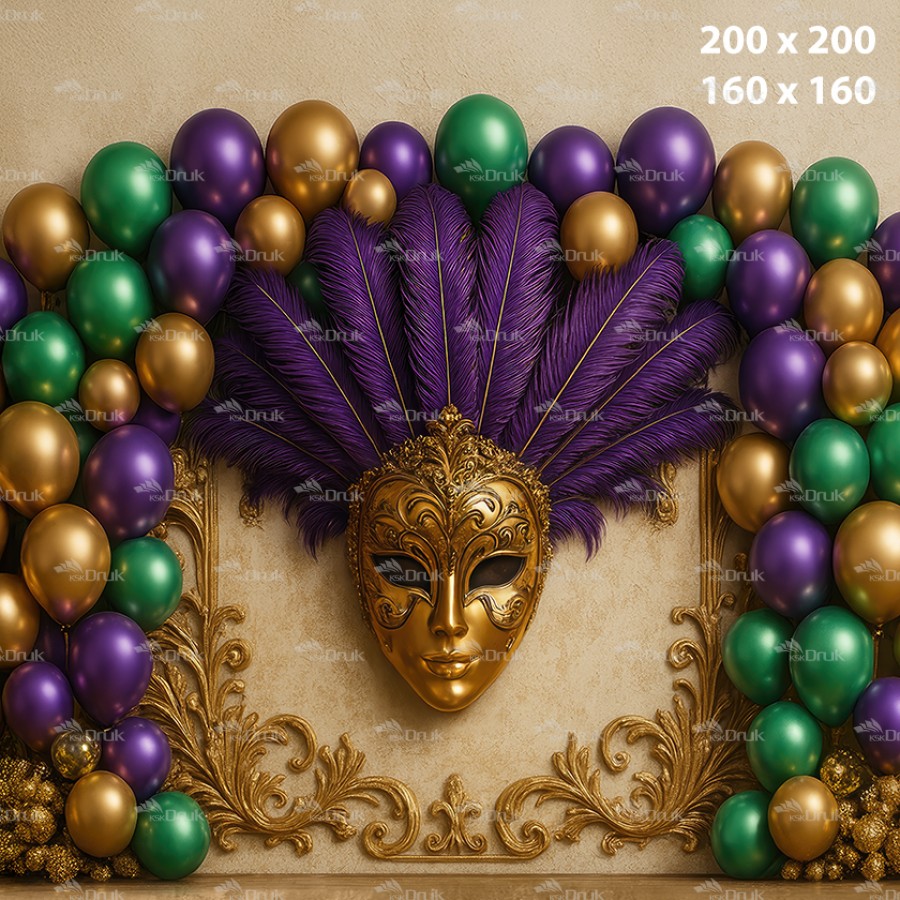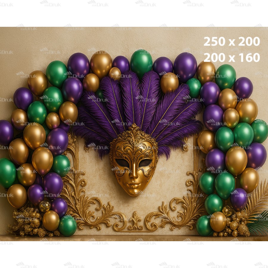 Tagi: tło karnawałowe; maska wenecka; bal maskowy; pióra; balony; złoto zieleń fiolet; luksus; dekoracja eventowa; backdrop venetian; ścianka fotograficzna; KSK DRUK; K_181