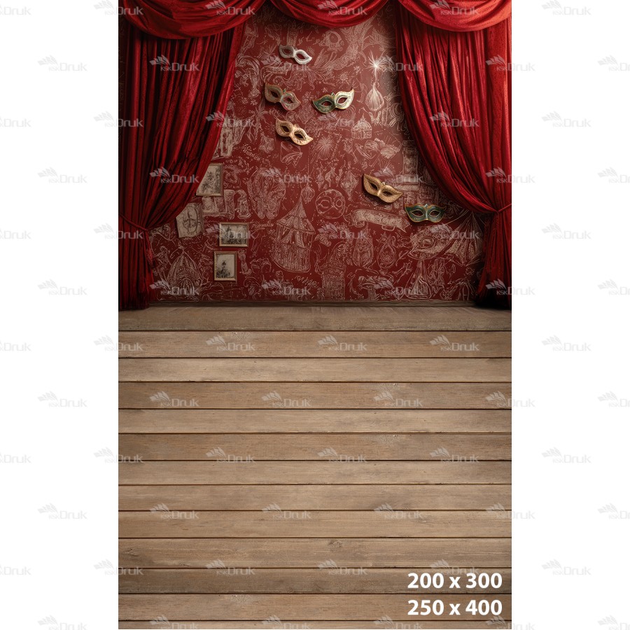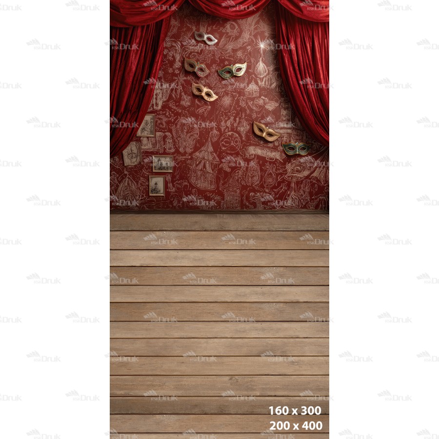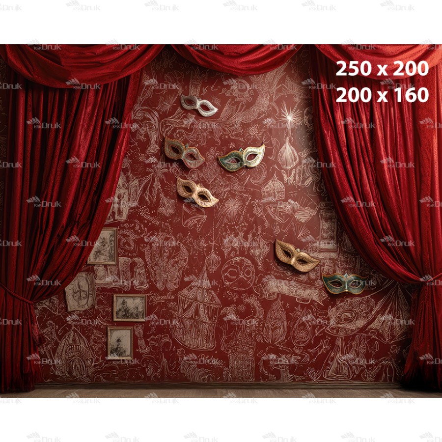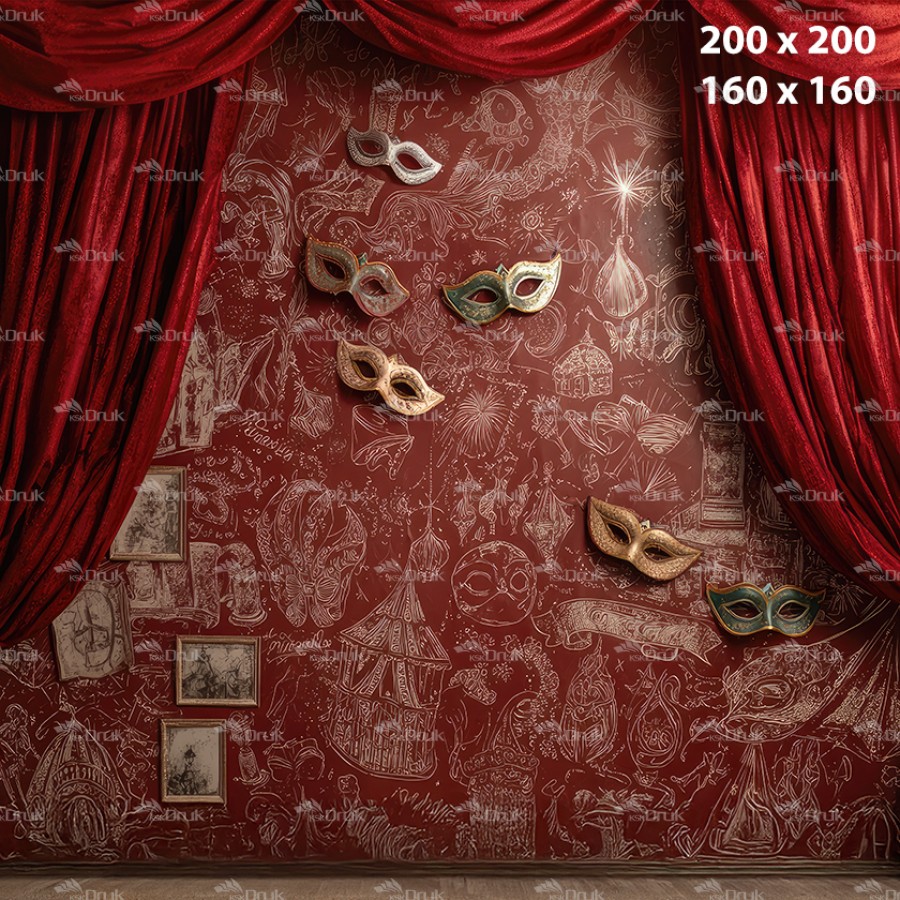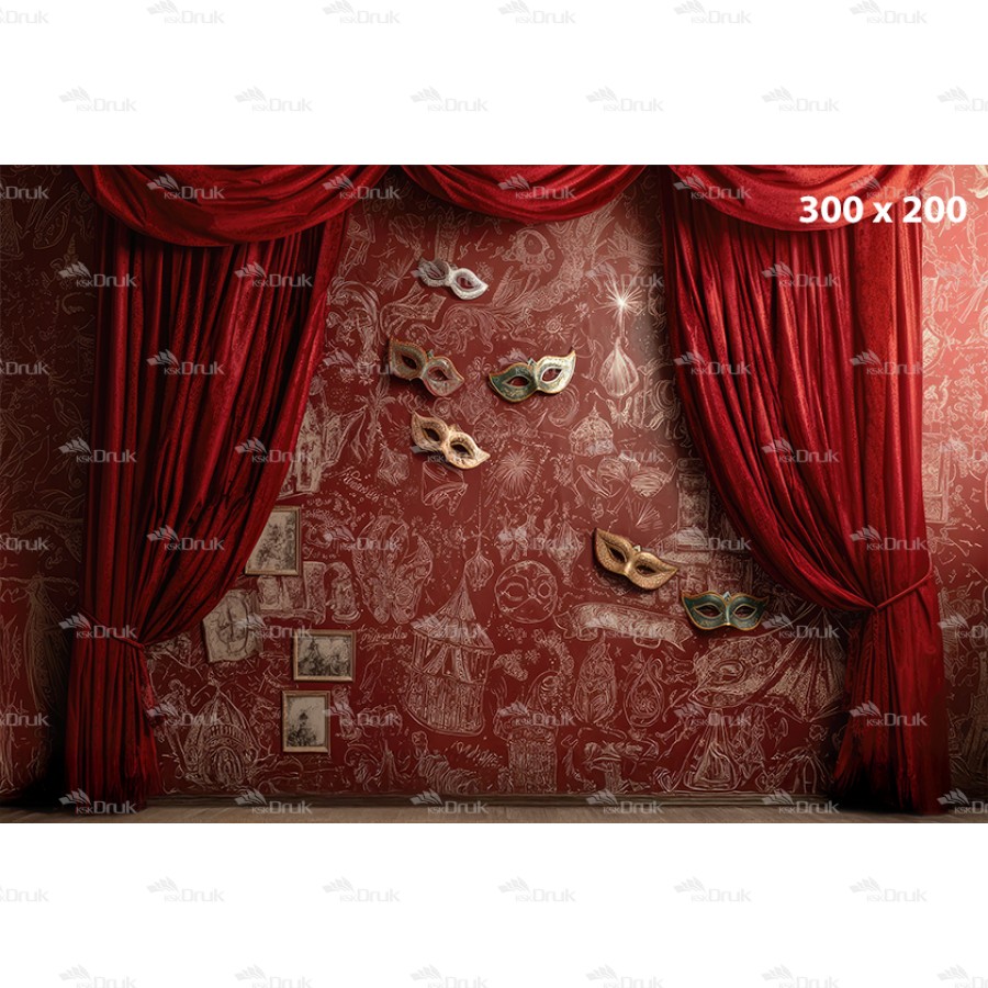 Tagi: tło karnawałowe; tło teatralne; czerwone kotary; maski; maskarada; wenecki styl; bal maskowy; tło eventowe; dekoracja sali; backdrop carnival; KSK DRUK; K_188
