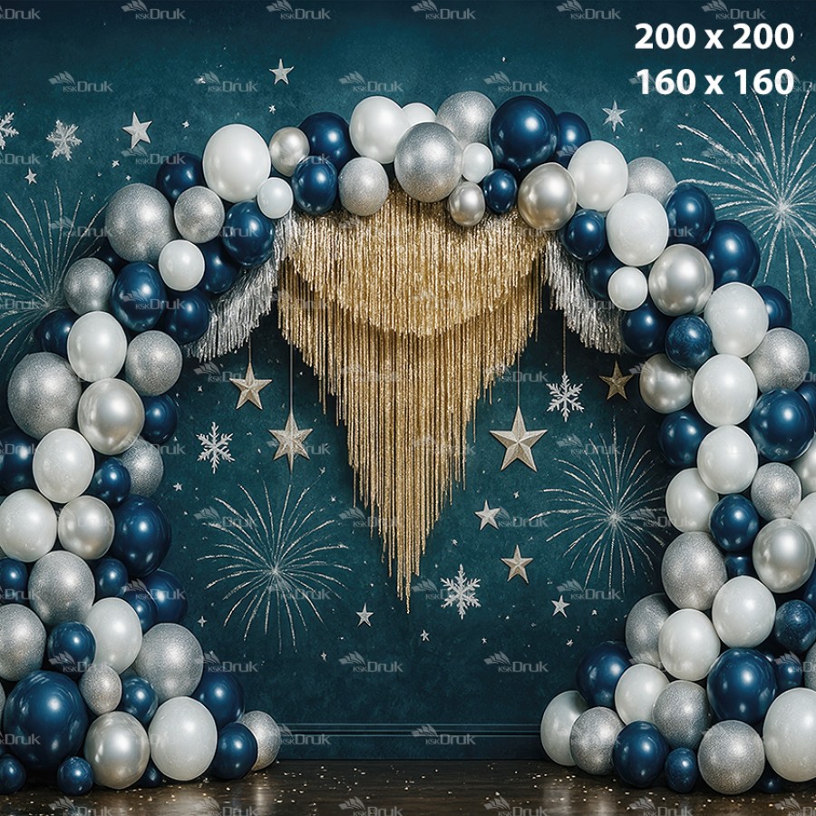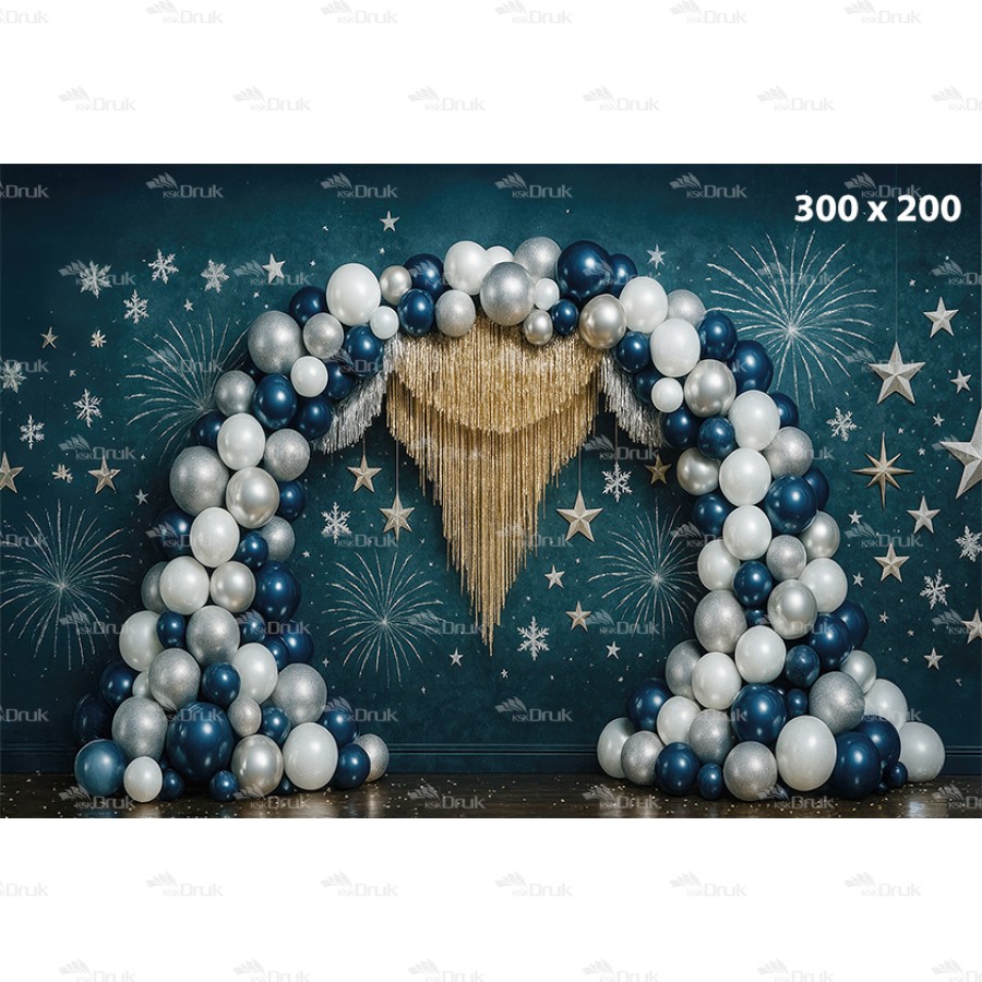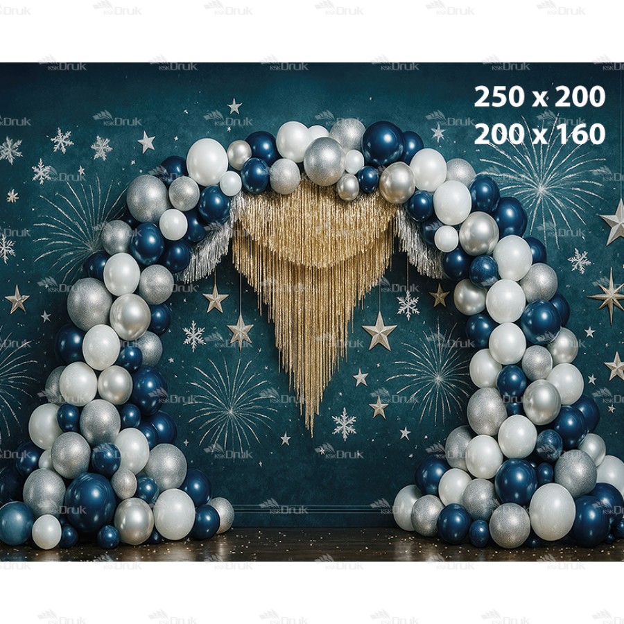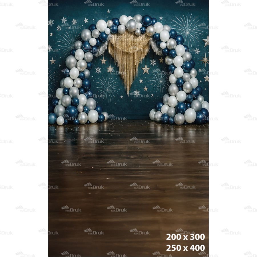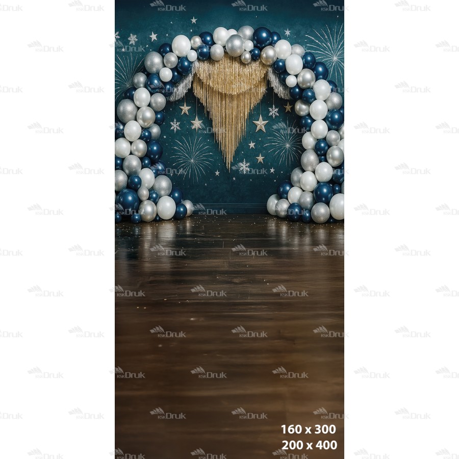 Tagi: tło karnawałowe; granatowe; srebrne; balony; złota girlanda; fajerwerki; gwiazdy; glamour; tło sylwestrowe; tło eventowe; backdrop glamour; KSK DRUK; K_187