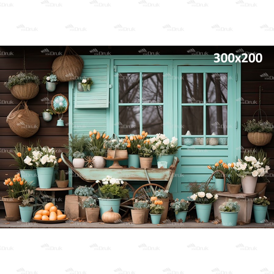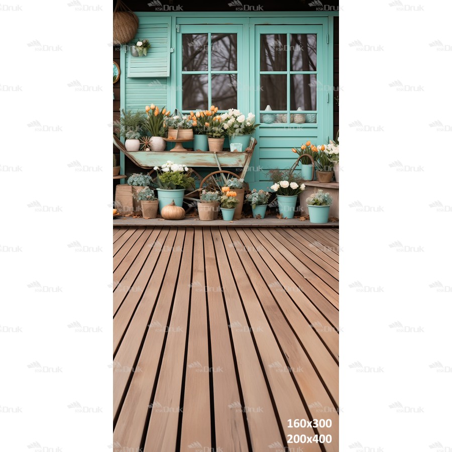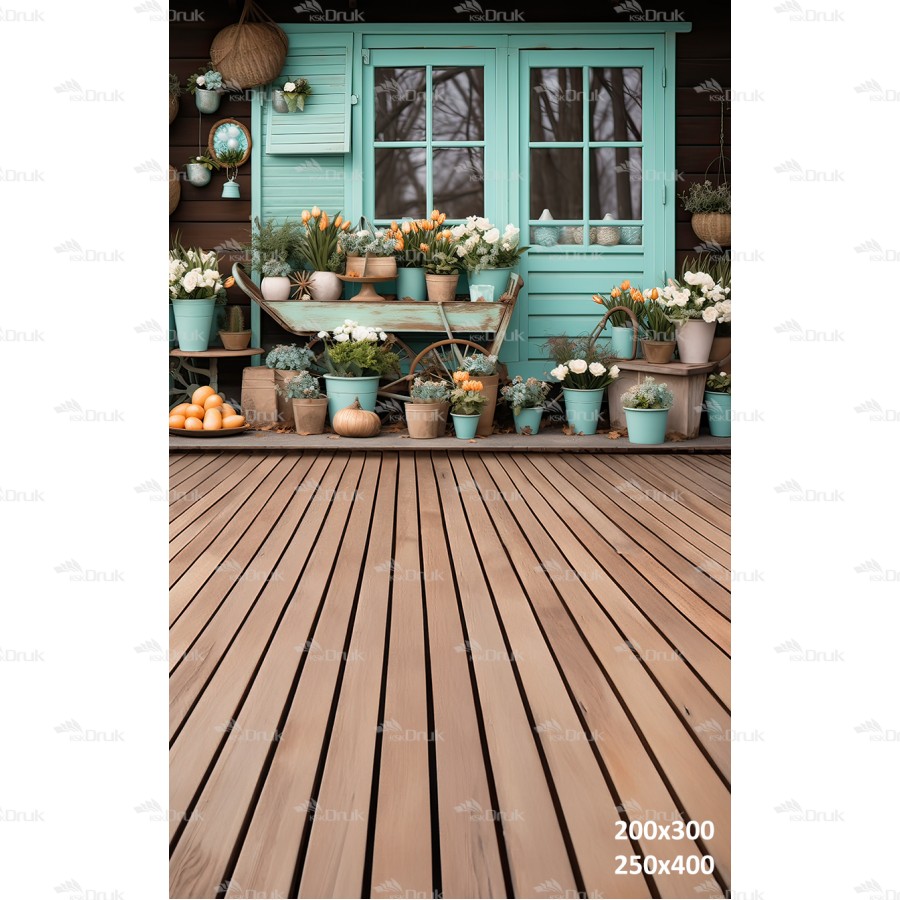 Tagi: Tło fotograficzne E123 wiosna, wielkanoc, drewniany domek, turkusowe okna, doniczki z kwiatami, kwiaty białe i pomarańczowe, tulipany, wiszące i stojące dekoracje, jasna drewniana podłoga, deski