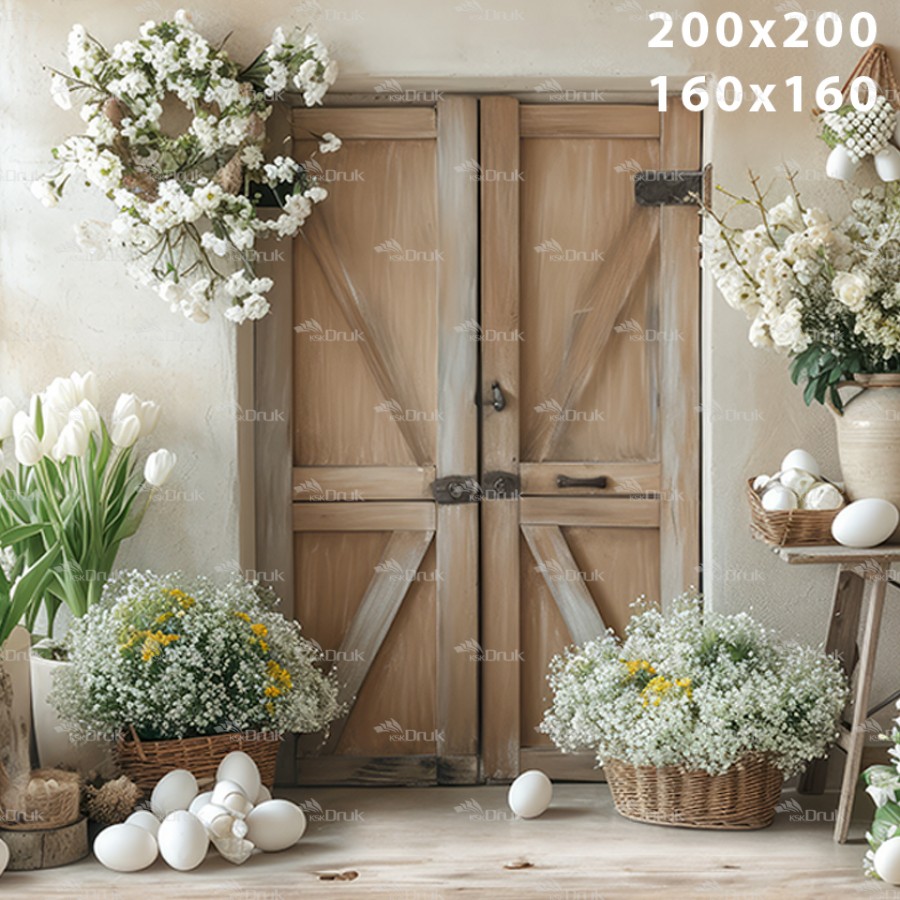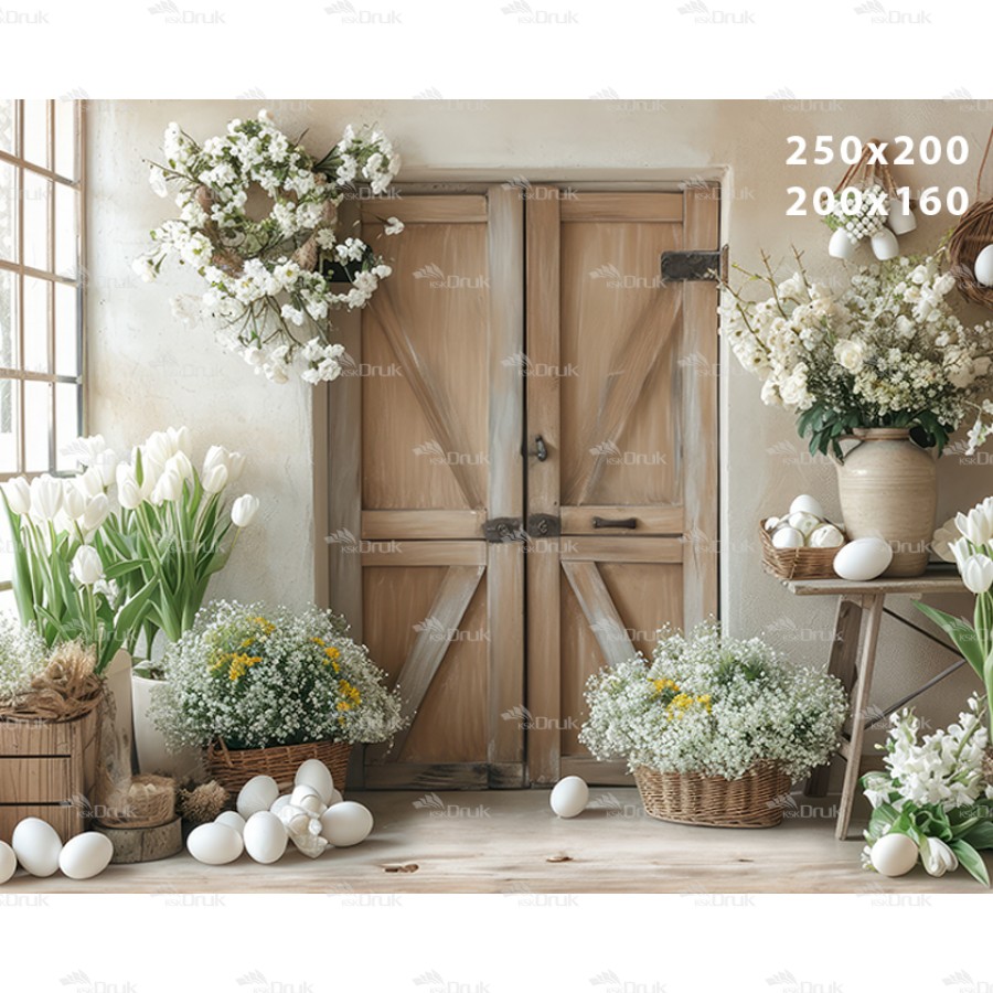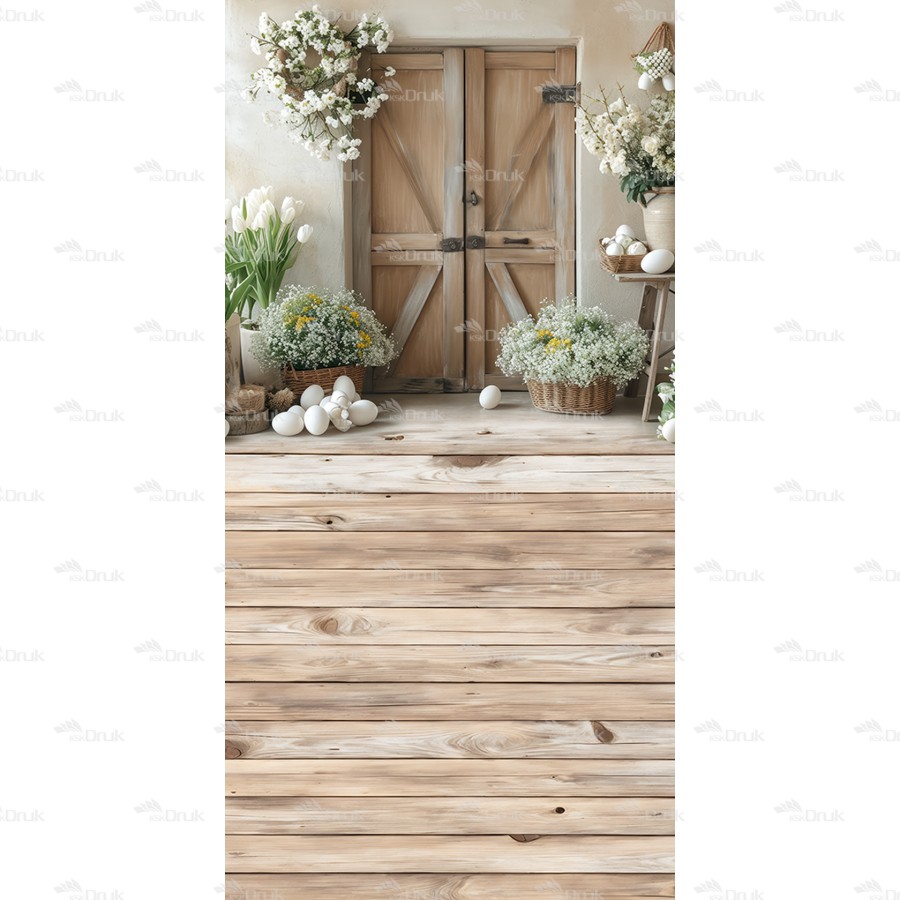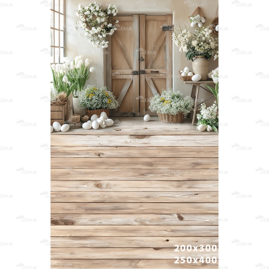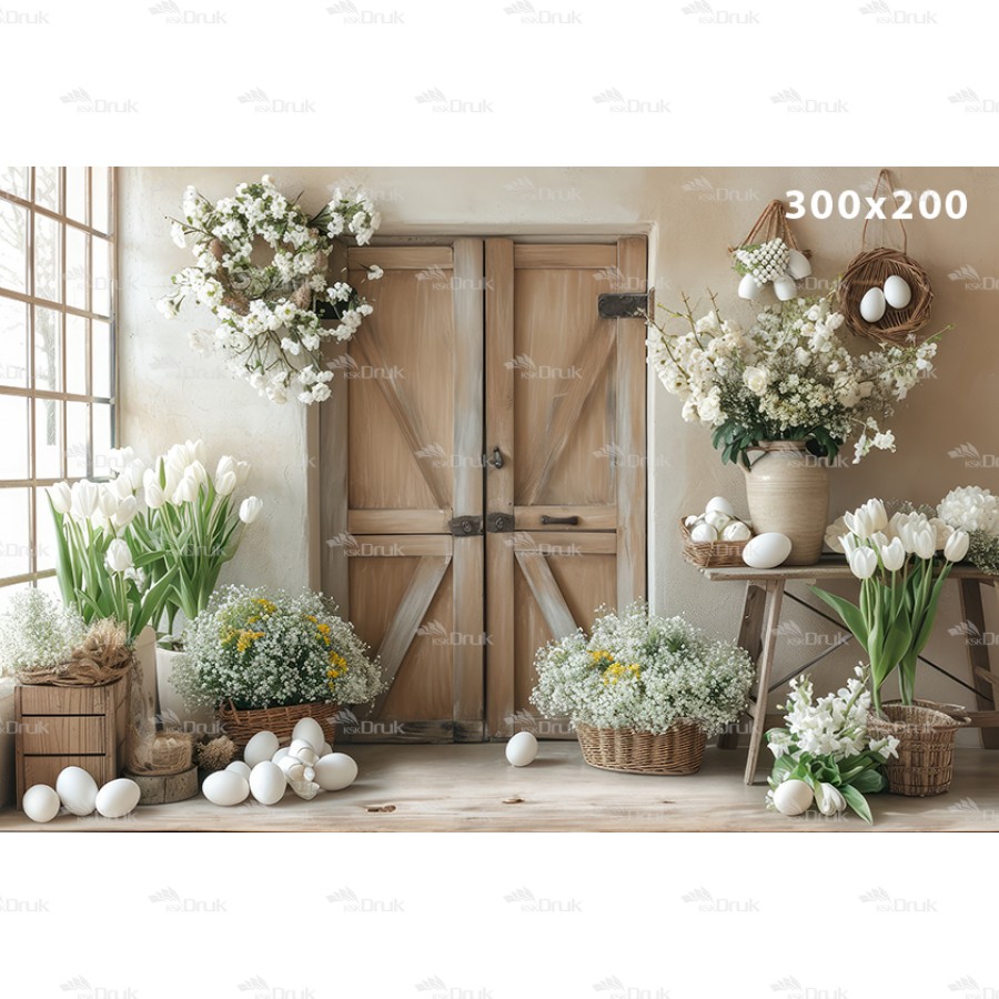Tagi: Tło fotograficzne E171, białe tulipany, białe kwiaty, drewniane drzwi, biała ściana, okno, jajka, wiosna, wielkanoc, drewniana podłoga