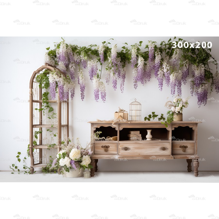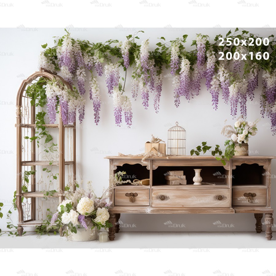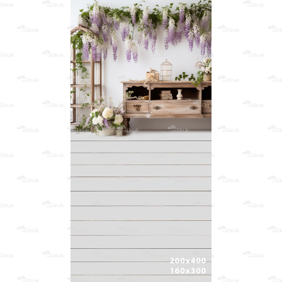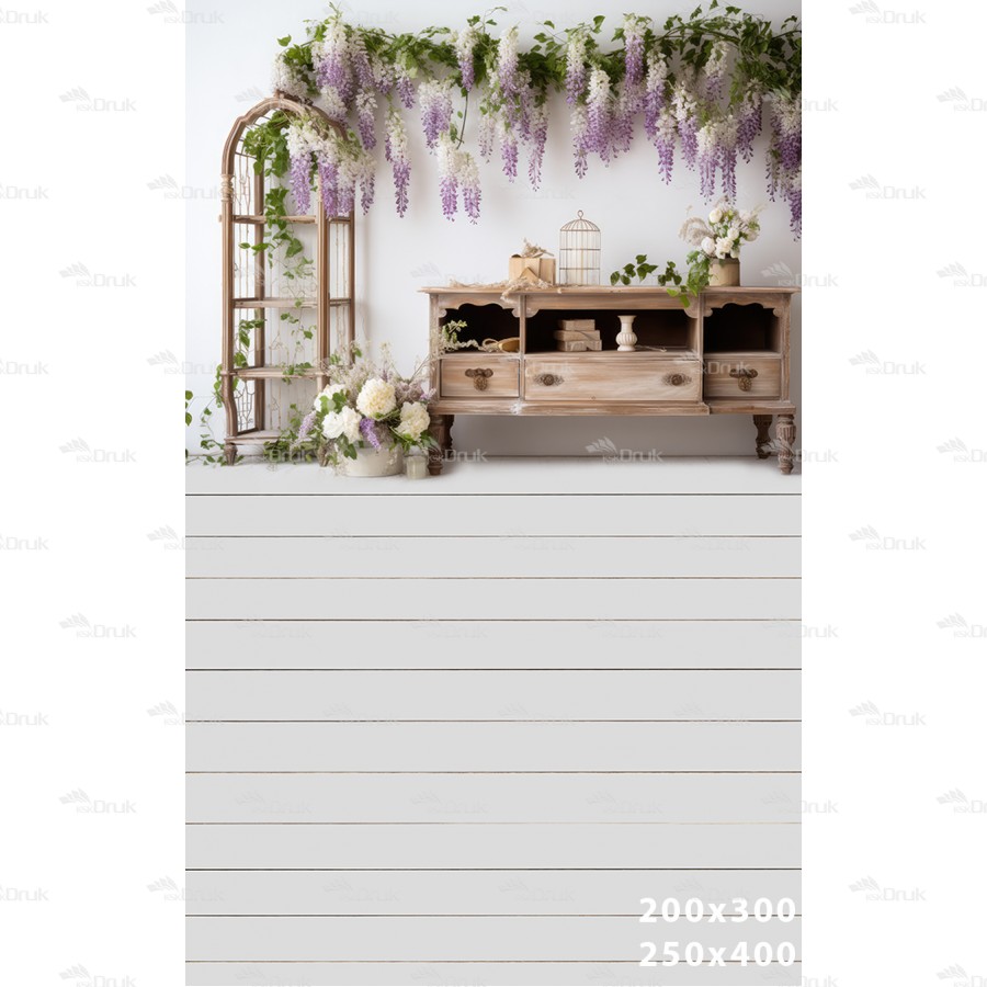 Tagi: Tło fotograficzne E199, fioletowe kwiaty, wiosna, biała ściana, drewniana szafka, białe kwiaty, biała drewniana podłoga