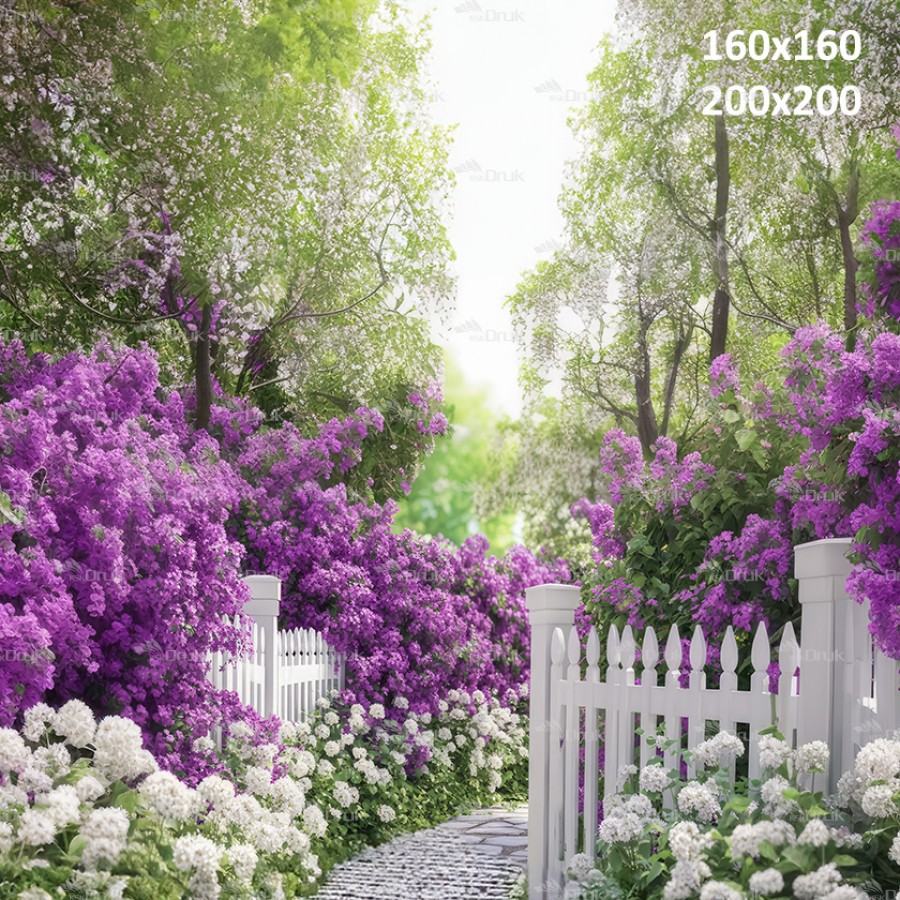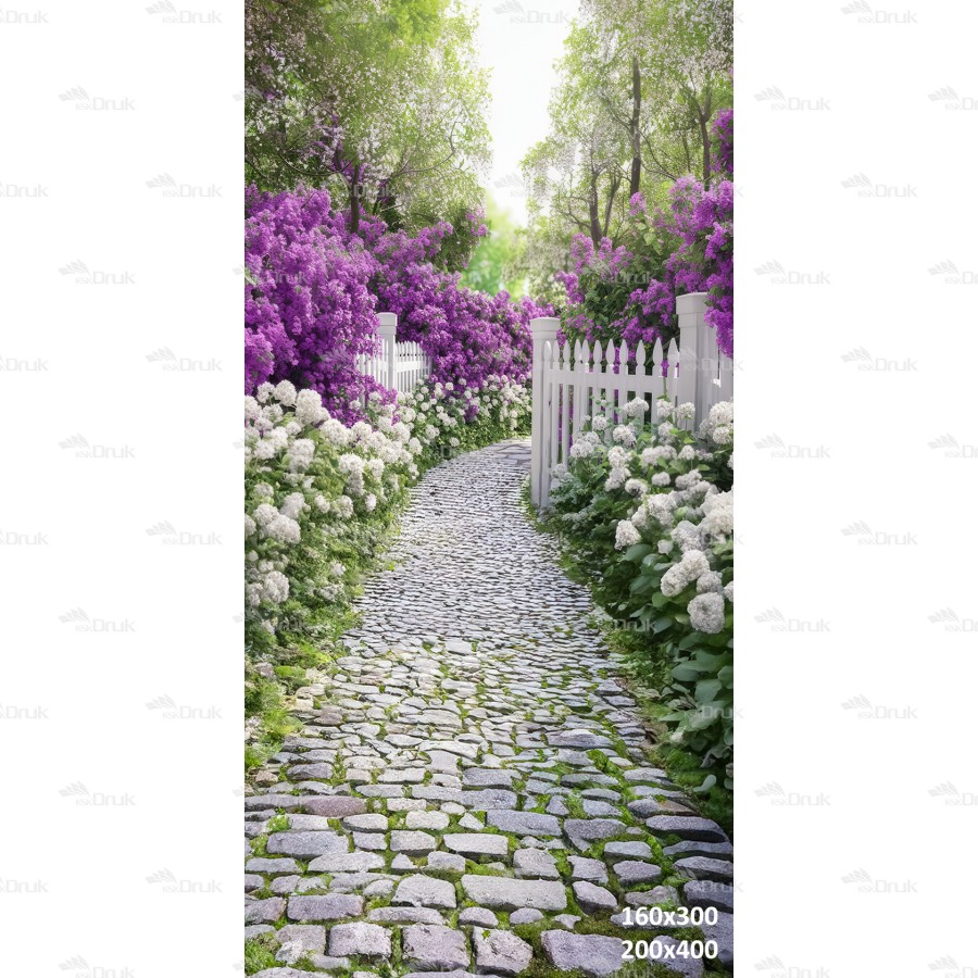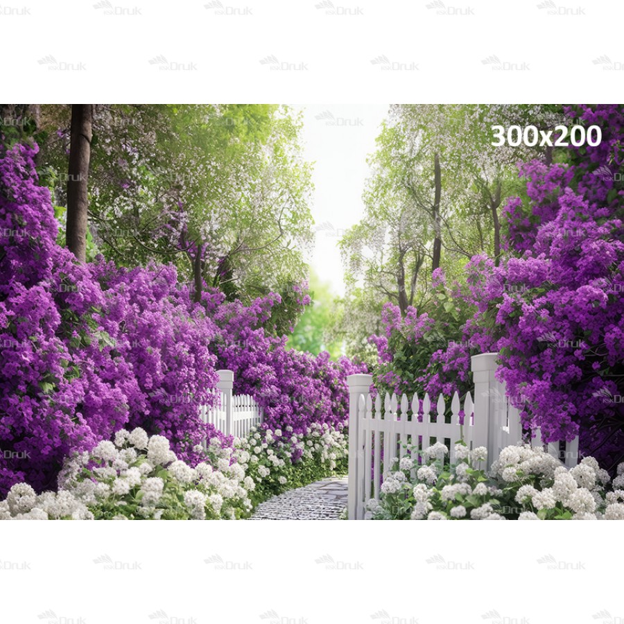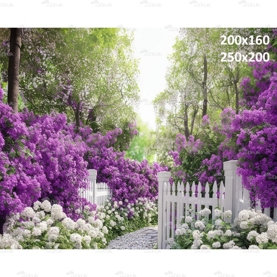 Tagi: Tło fotograficzne E515, tło wiosenne, wiosna, kwitnący sad, kwitnący ogród, biały płot, kamienna ścieżka, białe i fioletowe kwiaty