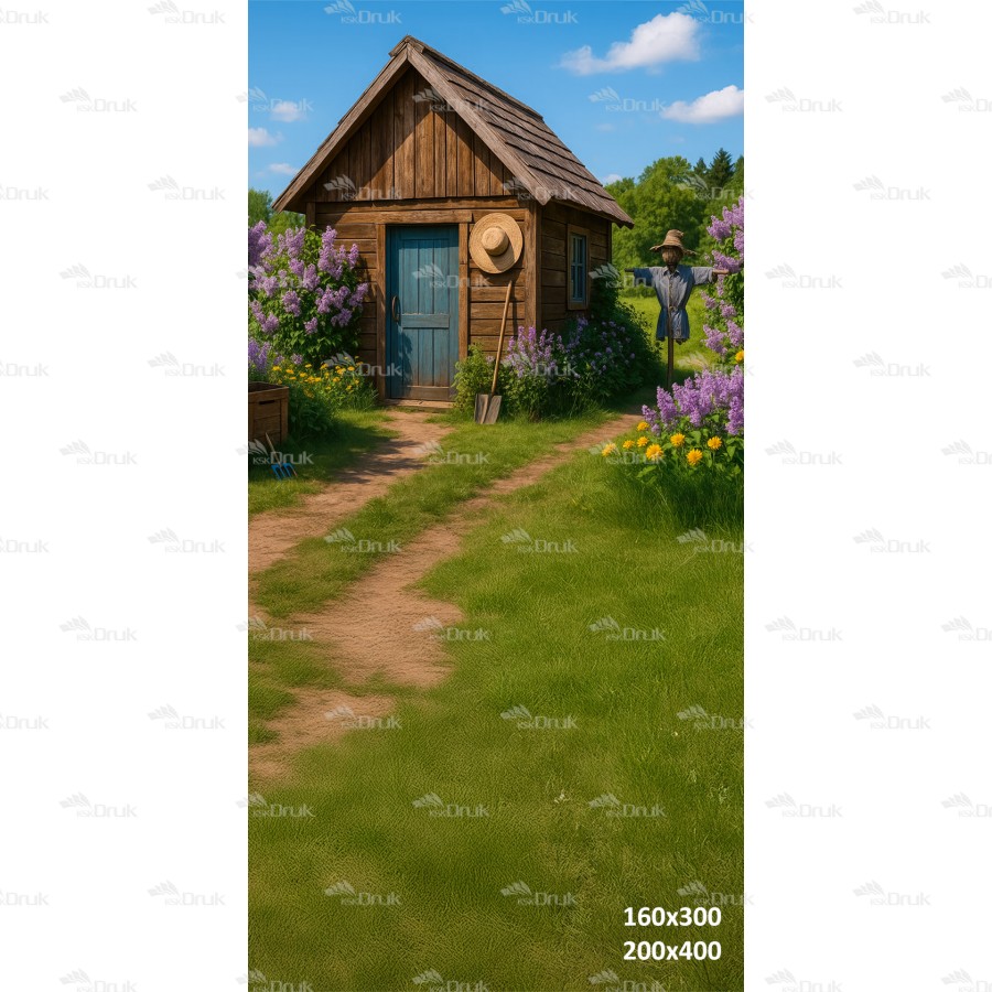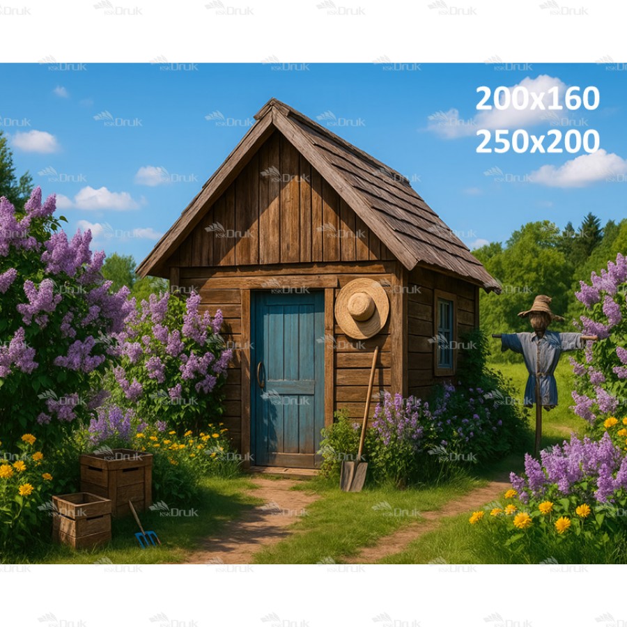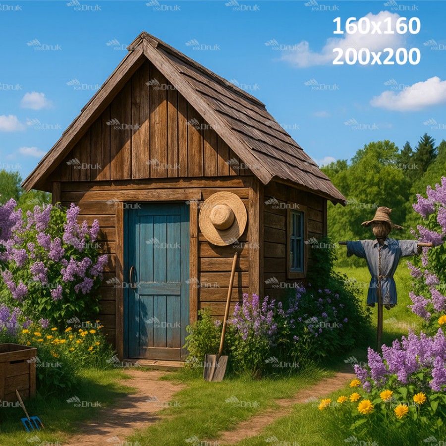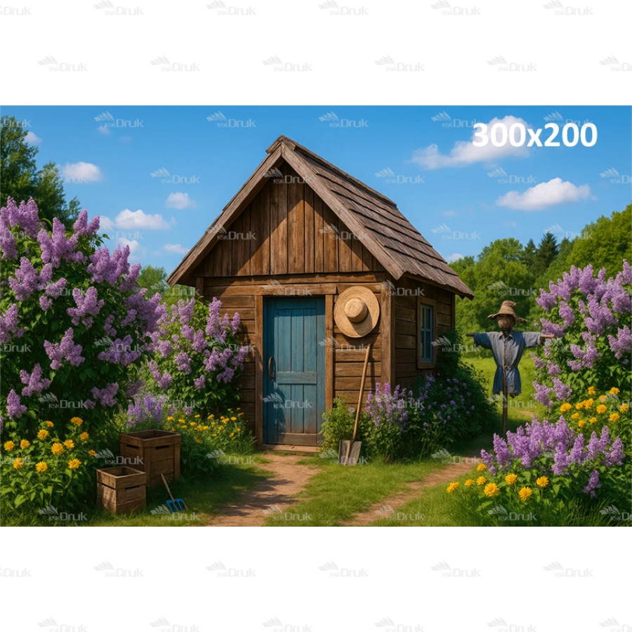 Tagi: Tło fotograficzne Domek 3623, tło wiosenne, wiosna, domek na narzędzia ogrodnicze, strach na wróble, fioletowy bez, trawa