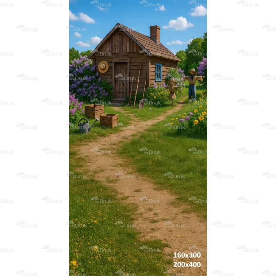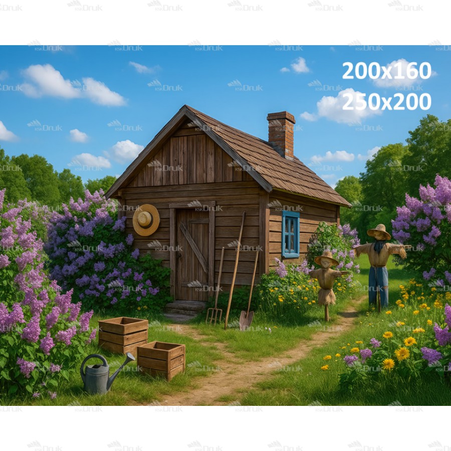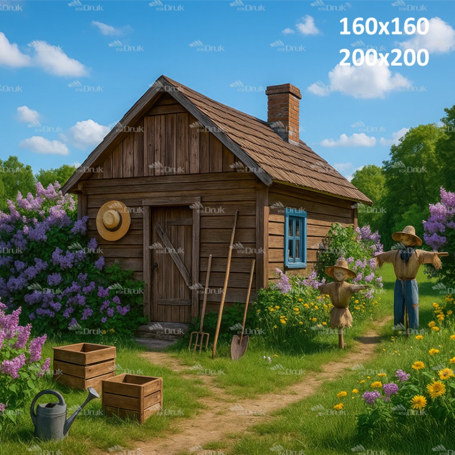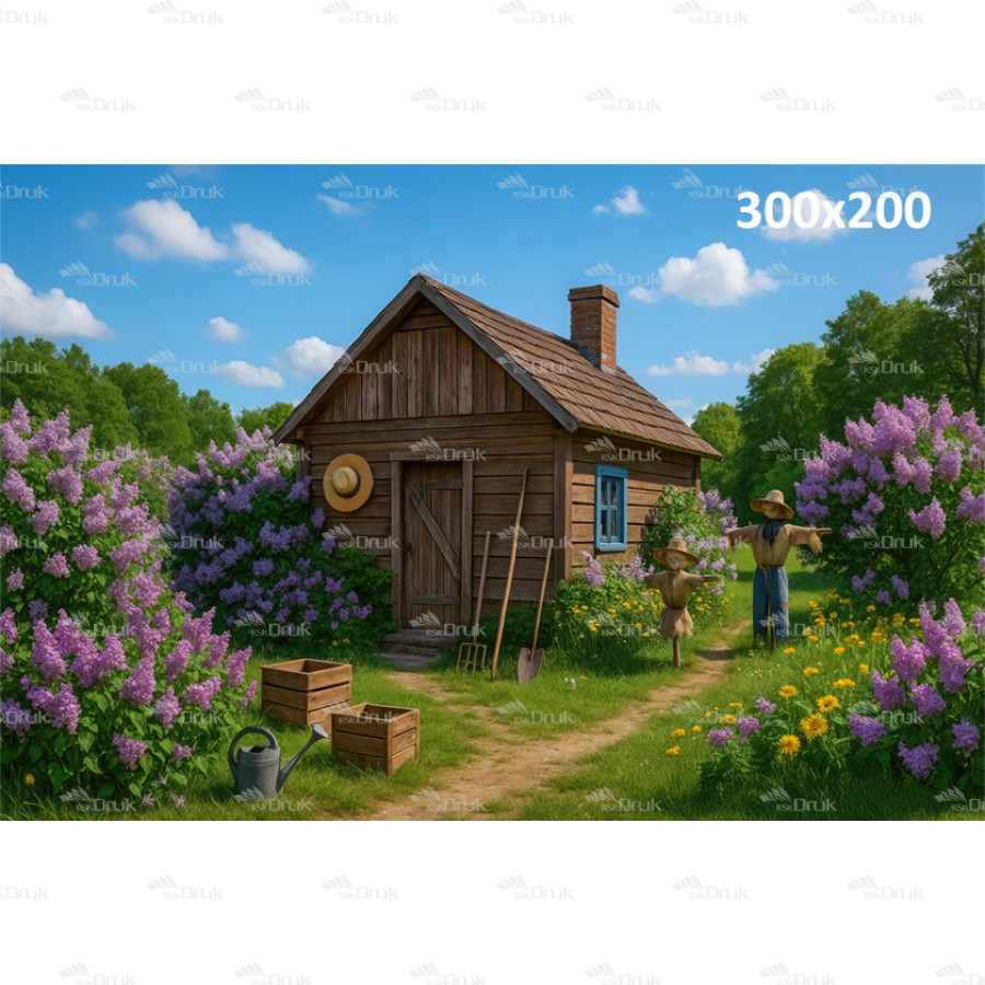 Tagi: Tło fotograficzne Domek 3624, tło wiosenne, wiosna, domek na narzędzia ogrodnicze, strach na wróble, fioletowy bez, trawa