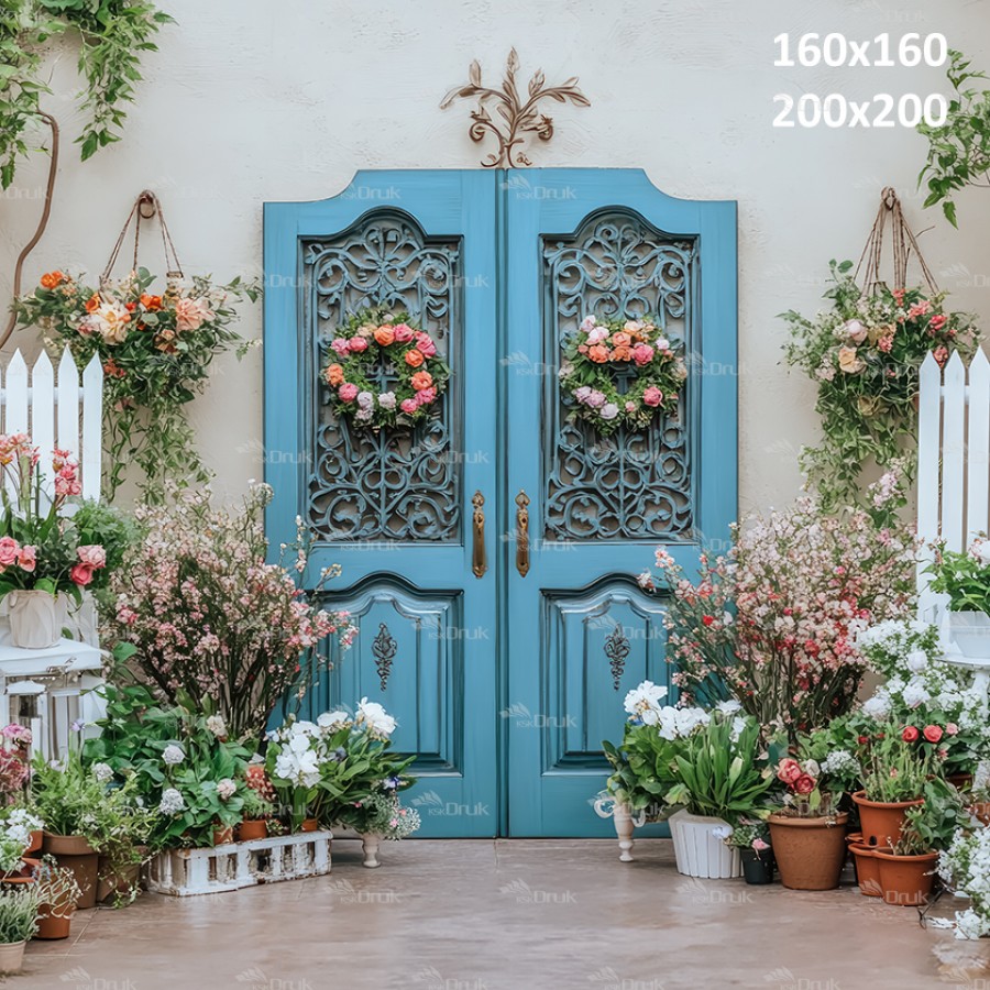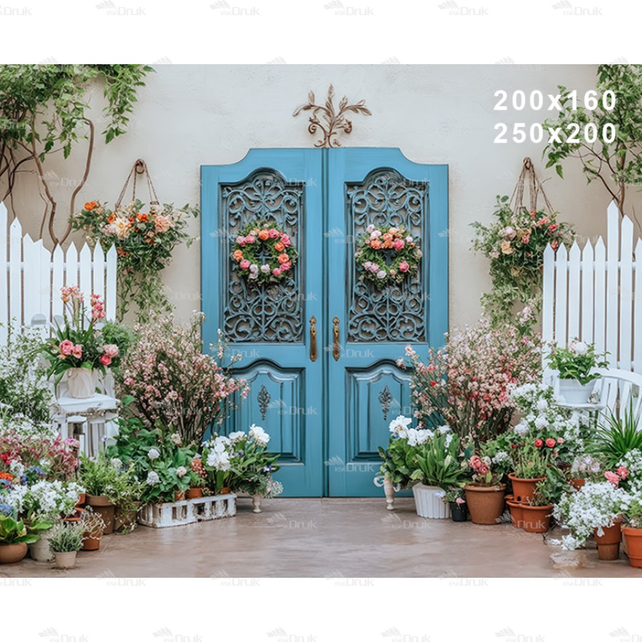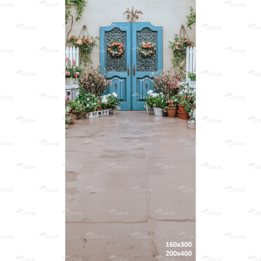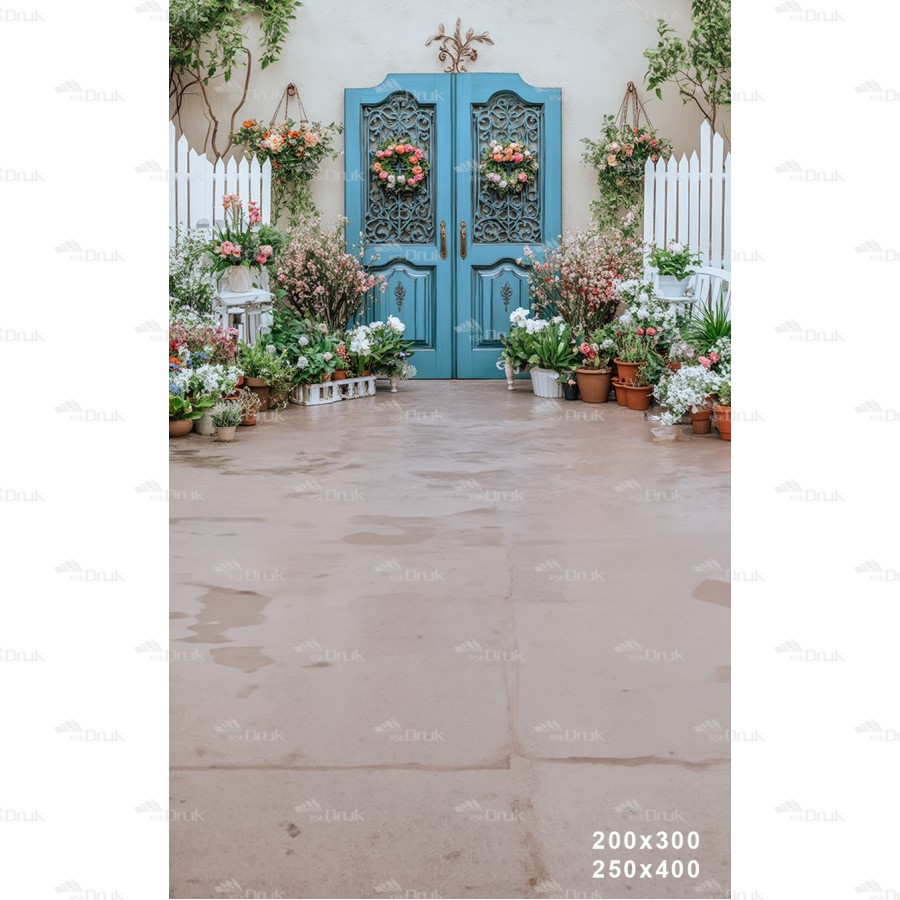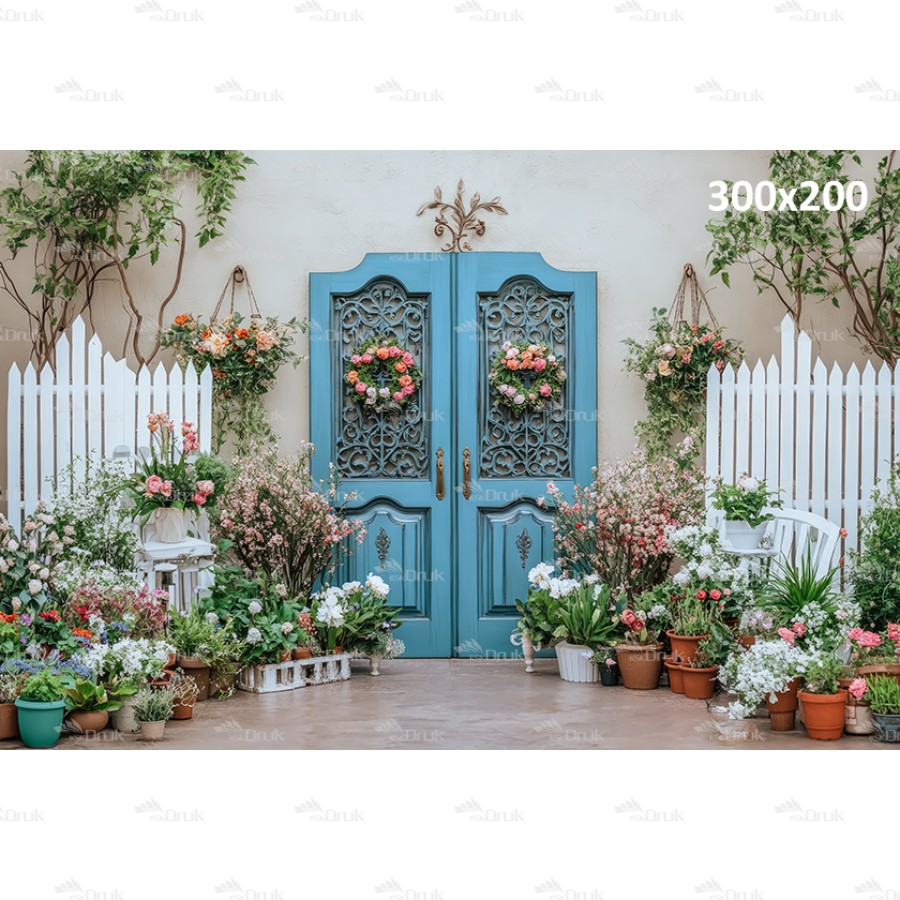 Tagi: Tło fotograficzne E449 tło wiosenne, wiosna, niebieskie drzwi, biały płotek, kwiaty